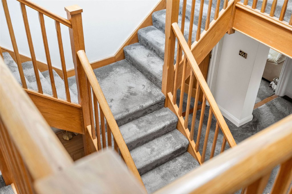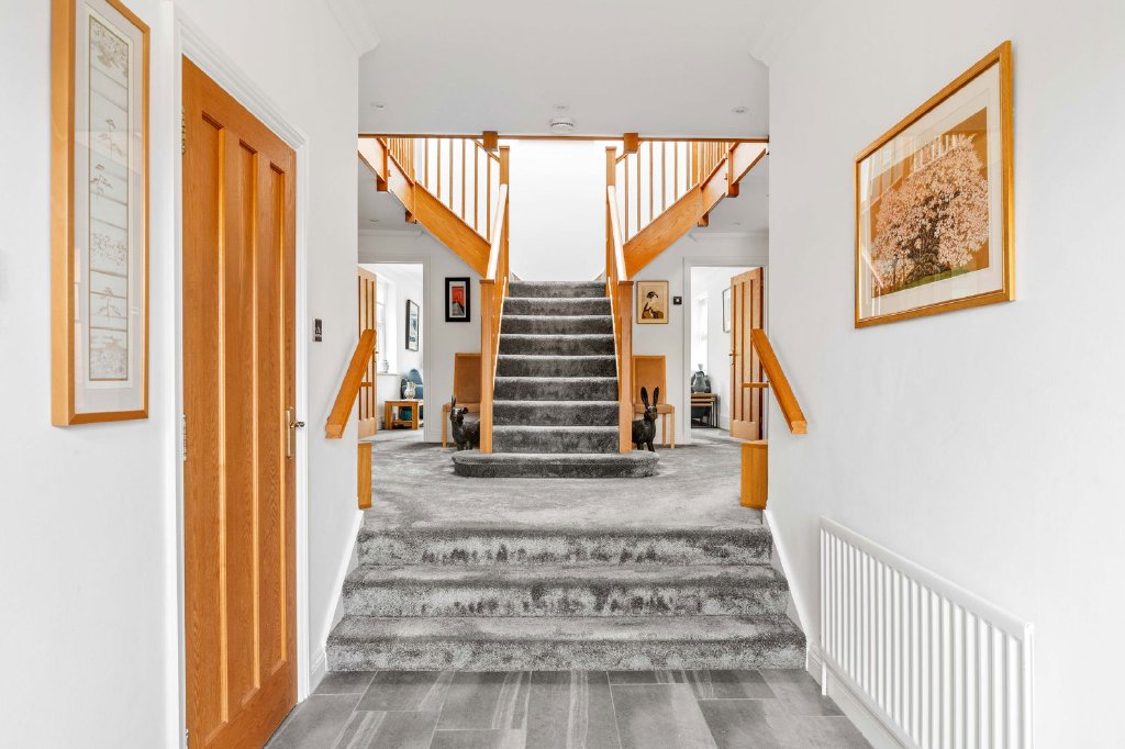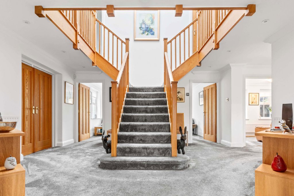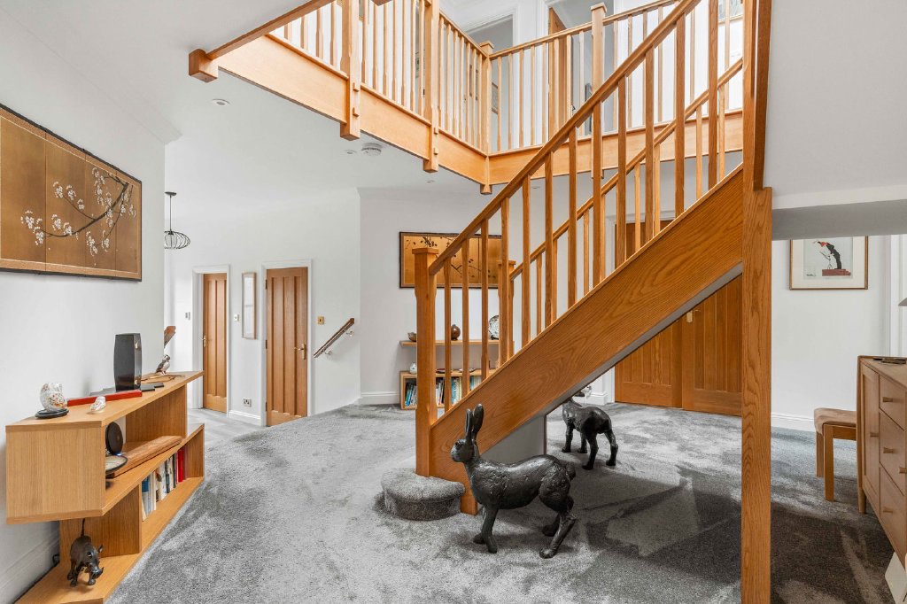 Upon entering, a striking oak staircase rises through the heart of the home to a dramatic galleried landing, establishing a powerful architectural centrepiece and setting the tone for the quality and craftsmanship throughout.