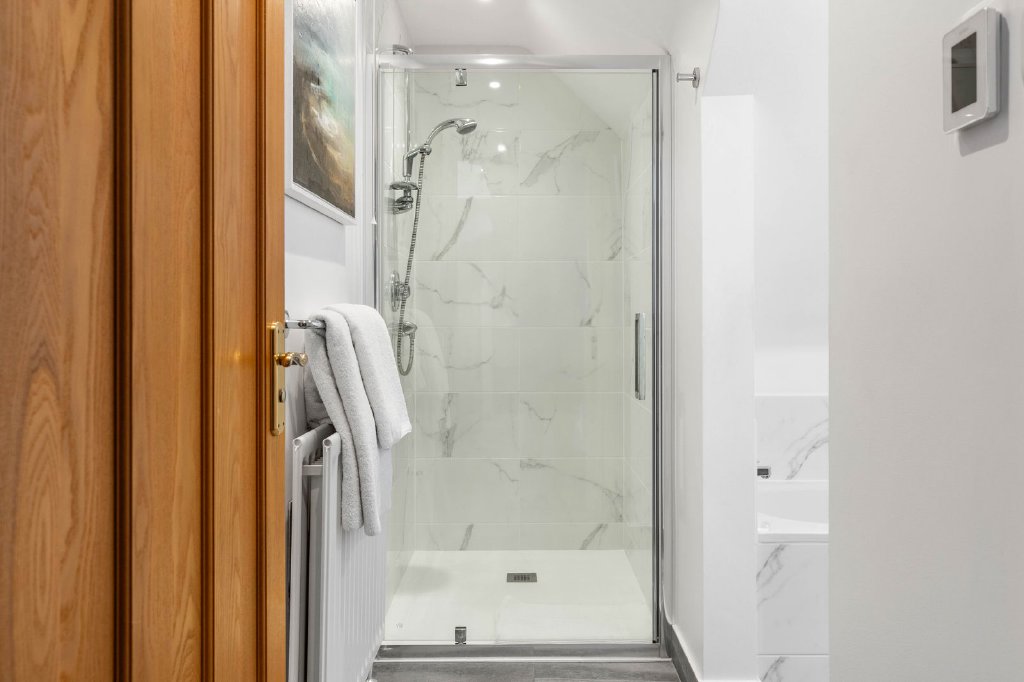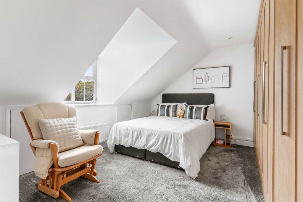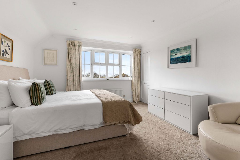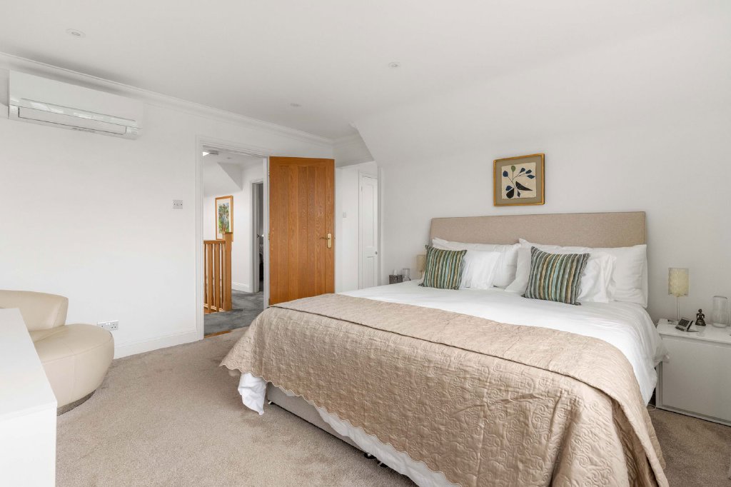 The first floor is crowned by a light-filled galleried landing, illuminated by six Velux skylights, leading to five generously proportioned bedrooms. The principal suite is a private sanctuary, featuring a dedicated dressing room and a luxurious sense of scale and privacy. A second bedroom enjoys garden views and its own en-suite shower room, creating a perfect guest suite. Three further bedrooms are served by a beautifully appointed family bathroom with bath and separate shower. Bespoke fitted furniture enhances several of the bedrooms, combining elegance with intelligent storage solutions.