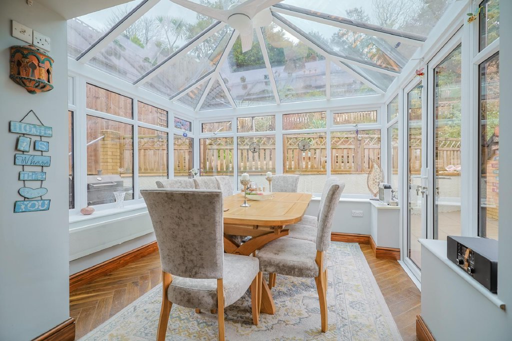 Situated just off the breakfast area, the conservatory is a stunning addition, bathed in natural light from its surrounding windows and enhanced by double patio doors leading out to the garden. Featuring herringbone flooring and a ceiling fan, this versatile space offers flexibility for a variety of uses while creating a seamless indoor-outdoor connection.