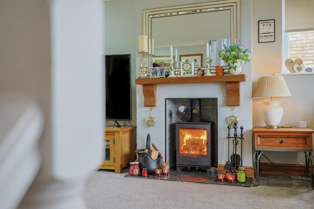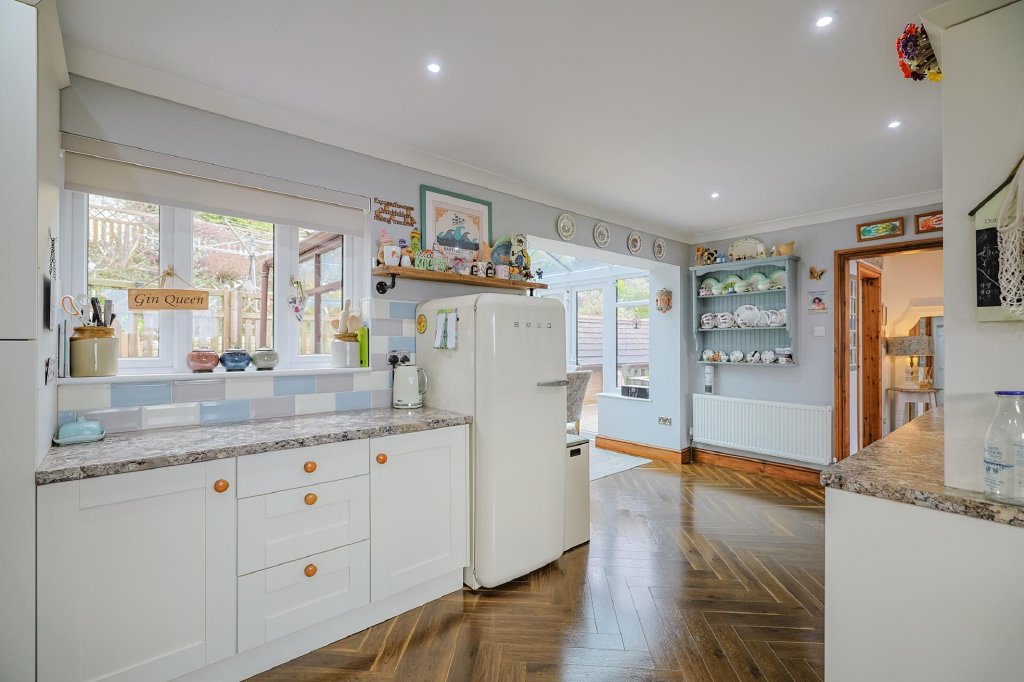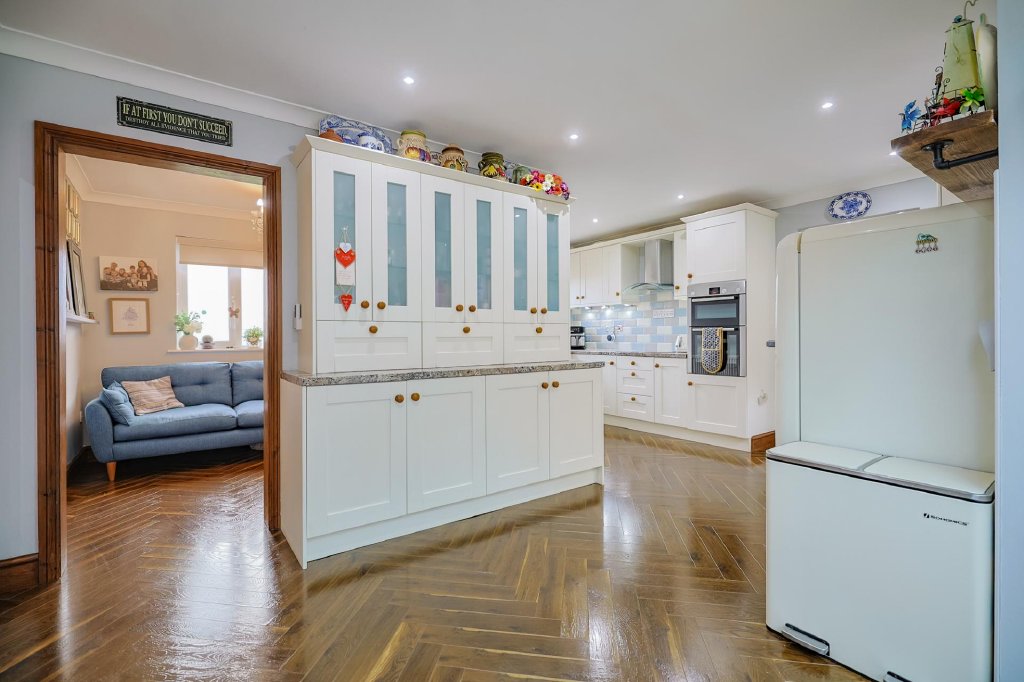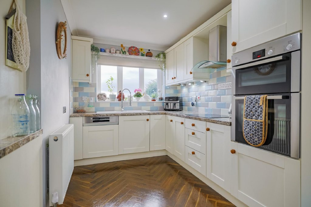 Herringbone flooring flows effortlessly into the open-plan kitchen/breakfast room, a generous and sociable space ideal for family living. Dual aspect windows allow light to pour in, with the front window once again capturing those beautiful views. The kitchen is fitted with a range of wall and base units and benefits from integrated appliances including a Bosch oven/grill, AEG four-ring induction hob, Cooke & Lewis extractor, Bosch dishwasher, and a double porcelain sink with adjustable tap. There is ample room for a breakfast table, along with space for a freestanding fridge/freezer, making this truly the heart of the home. From here you have access to the rear of the home.