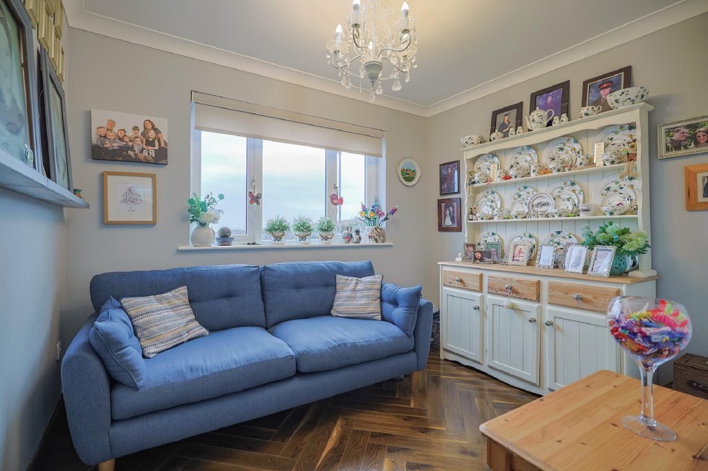 The dining room is another versatile reception space, boasting a large front-facing window that captures outstanding views. Natural light beams through, enhancing the herringbone flooring and coving.