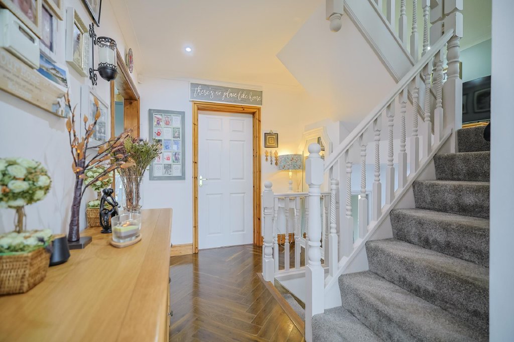 You are welcomed into a bright and airy, spotlit entrance hallway, beautifully finished with herringbone flooring. A striking three-storey window to the front floods the space with natural light while perfectly framing those stunning coastal views. This impressive entrance acts as a central hub, seamlessly connecting you to the main living areas of the home.