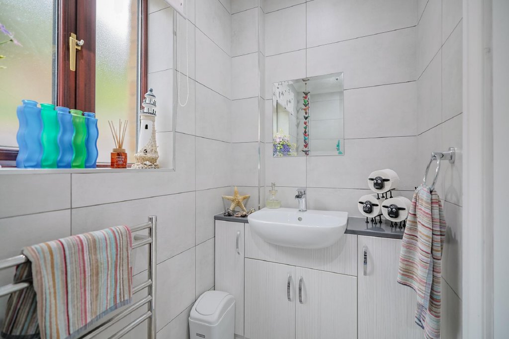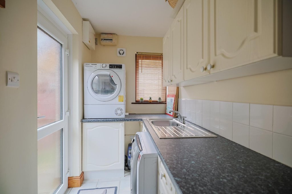 Also on this level is a useful utility room, fitted with additional wall and base units, a single stainless-steel sink, and space for an under-counter appliance. Finished with tiled flooring, an extractor fan, and a side window, it also provides convenient access to the rear of the property.