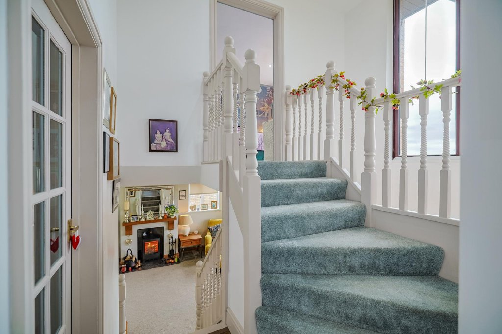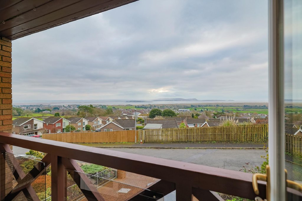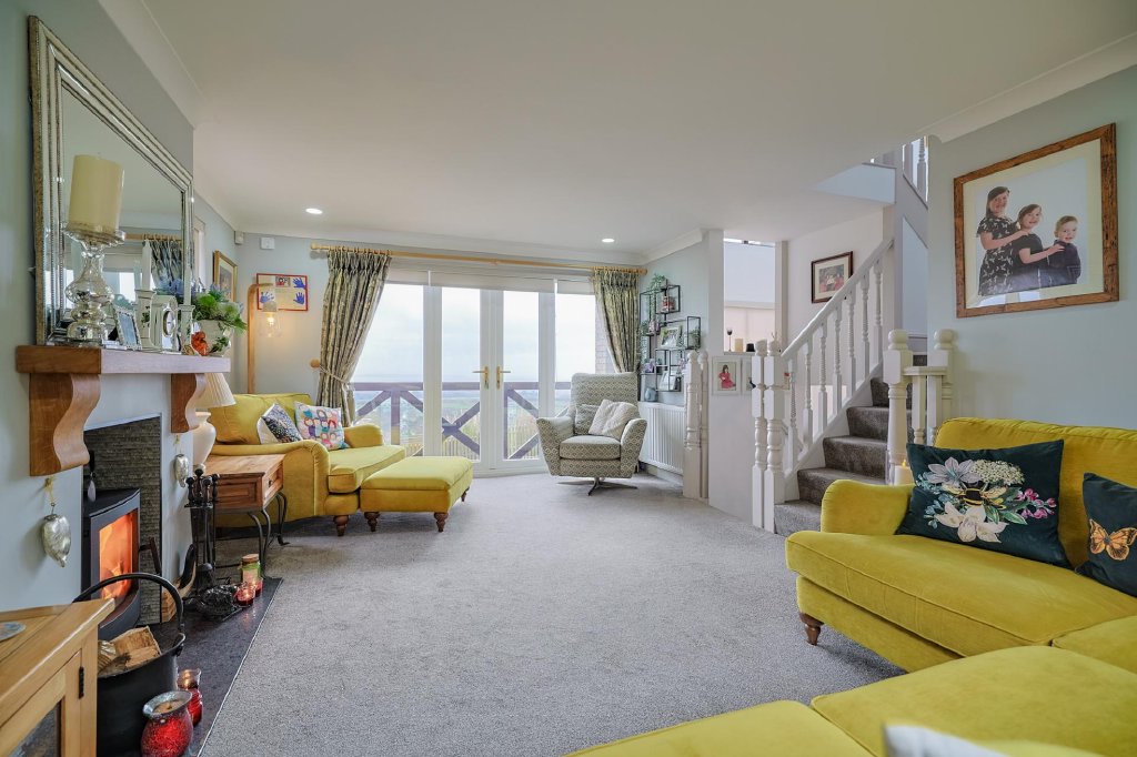 A carpeted staircase leads you to the impressive lounge from the entranceway, a spacious and inviting room where the views truly take centre stage. A large floor-to-ceiling window and double patio doors open onto a balcony, offering breathtaking vistas across the estuary and coastline. This cosy yet expansive room features a wood burner with granite hearth, spotlighting, and triple aspect windows, including a large rear window overlooking the garden. From here, steps lead up to a hallway serving three bedrooms and the family bathroom.