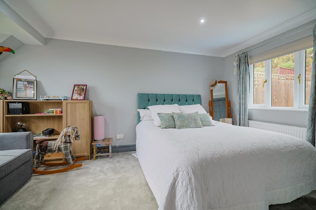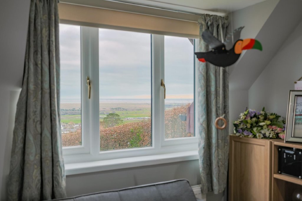 Bedroom three is a bright and charming single room with vaulted ceiling, carpeting, coving and spotlighting, and enjoys stunning views across the estuary and coastline.