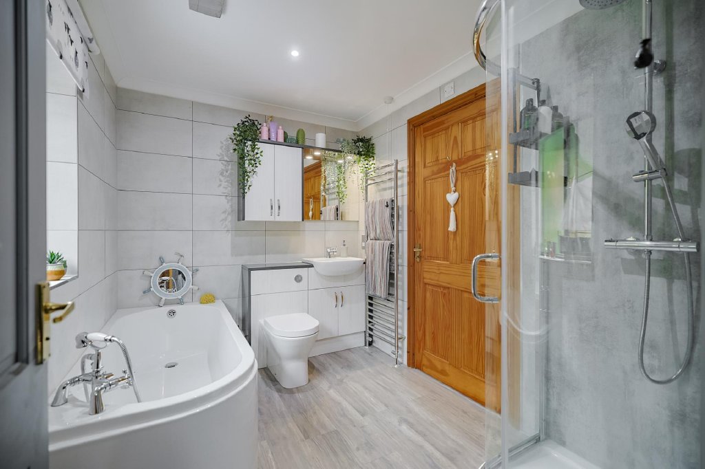 The family bathroom is well-appointed with a RAK WC, wash basin with storage beneath and above, a fitted bath with handheld shower head, and a separate walk-in shower. Finished with laminate flooring, a heated towel rail, spotlighting, extractor fan, and a combination of tiled and panelled walls, it also features a frosted rear window.