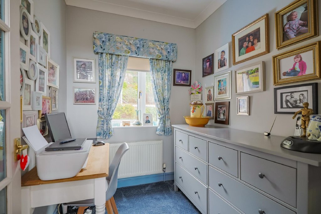 Bedroom four, currently used as a study, is another single room featuring carpeting, coving and a rear-facing window with pleasant garden views.