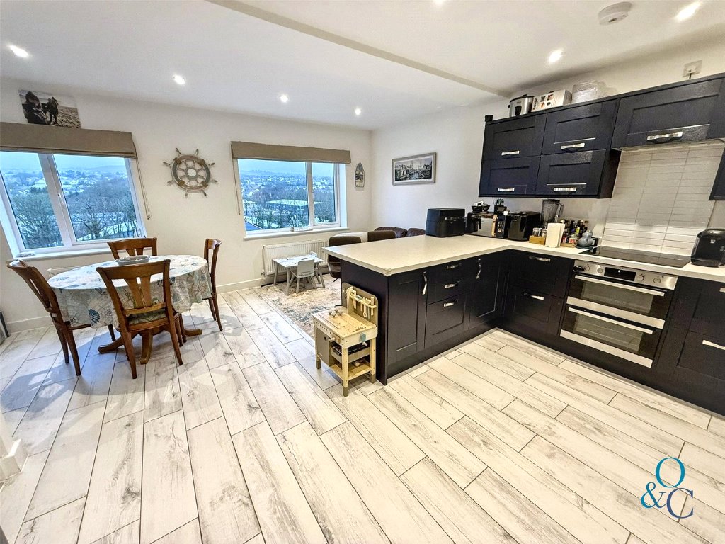 The kitchen is fitted with an impressive range of base and wall units, worktop with breakfast bar area, integrated electric hob with hood above, electric double oven, fridge/freezer, dishwasher, one and half bowl stainless sink unit. The dining area offers elevated views towards St Austell with ample natural light filtering through large windows.