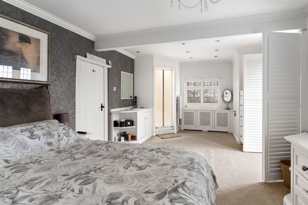 Moving upstairs is a landing off which are the bedrooms and the large family bathroom. The main bedroom is a good size double room with fitted wardrobes, bespoke fitted cupboards including a wash basin and a walk in shower cubicle. There are double glazed windows to the front, side and rear and doors open out onto the balcony. A lovely spot to sit with a coffee on a summers day. Across the landing one finds another large double bedroom with spacious en suite bathroom. The third bedroom is a generous single/small double room with fitted wardrobes. The large family bathroom is particularly impressive with bath, bidet, wc and the wash basin set into a vanity unit. Off the landing a drop down ladder provides access to a generous loft space that could be converted to provide further accommodation if desired.