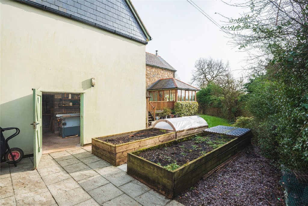 The property has its own private patio area, ideal for outdoor dining and entertaining, together with established garden space and areas perfectly suited to the cultivation of fruit and vegetables. A charming feature pond with an ornamental bridge provides an attractive focal point and leads down to