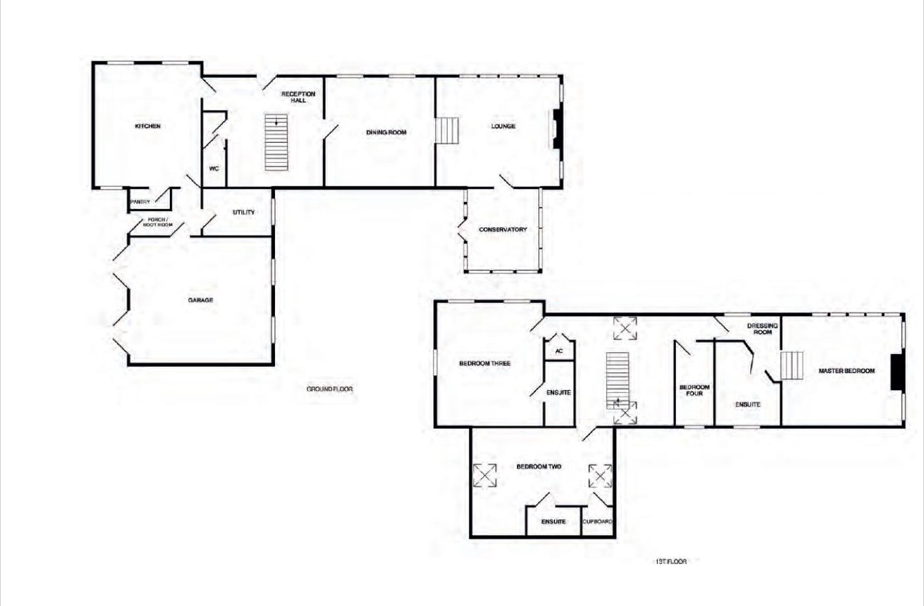The layout briefly comprises an inviting entrance hall, providing convenient internal access to the double garage and a well-appointed utility room. At the heart of the home lies an impressive open-plan kitchen and dining area, perfectly suited to both everyday living and social gatherings. A conveniently positioned cloakroom and downstairs WC sit adjacent to the striking oak staircase, which serves as a beautiful focal point within the home. Completing the ground floor is a superb, multi-level living space arranged over three tiers, creating both character and versatility. This impressive area incorporates a further dining space or additional reception room to suit individual requirements. The principal living area features striking full-height glazing, allowing natural light to pour in while perfectly framing the surrounding views. A charming log-burning fireplace provides a warm and inviting focal point. In addition, a delightful conservatory extends the living accommodation and offers direct access to the outside patio area, seamlessly connecting the home with its landscaped surroundings.