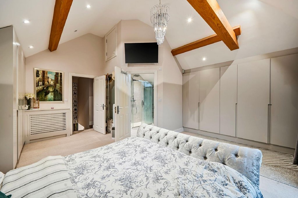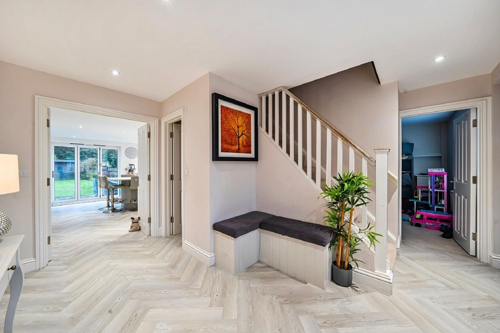 A beautifully refurbished and skillfully extended three/four bedroom detached family home, offering two/three reception rooms and two contemporary bath/shower rooms, set on a level plot in the very heart of Woldingham village. This deceptively spacious home has been thoughtfully redesigned to provide flexible accommodation ideally suited to a growing family, professional couple or downsizer seeking stylish, low-maintenance living. The property is approached via a generous shingle driveway, providing ample off-street parking and turning space, and leading to an integral single garage. The garage offers excellent storage and, subject to the usual consents, presents potential for conversion into additional living accommodation if required. A welcoming reception hall immediately sets the tone, showcasing the high standard of finish evident throughout. Recently laid, high-grade LVT flooring flows seamlessly from the hallway into the impressive open-plan kitchen/breakfast/family room. Double doors open into this superbly appointed space, which features bi-folding doors onto the south-facing terrace, creating an exceptional indoor-outdoor lifestyle. The contemporary kitchen is fitted with sleek grey high-gloss cabinetry, complemented by quartz work surfaces and a substantial central island providing generous preparation and informal dining space. Integrated appliances include a dishwasher, microwave, newly replaced double oven and induction hob. A separate utility room adds further practicality. An elegant archway leads through to the striking living room, enhanced by a vaulted ceiling and dual-aspect glazing, including wide bi-folding doors opening onto the terrace. A brick-surround fireplace with wood-burning stove provides a charming focal point, while underfloor heating ensures year-round comfort. Also accessed from the reception hall is a further versatile reception room, currently arranged as a playroom but equally suited as a fourth bedroom. A refurbished cloakroom is conveniently located nearby. Upstairs, the principal bedroom is a beautifully appointed retreat, featuring bespoke fitted furniture incorporating bedside units, a full range of wardrobes, providing extensive hanging and shelving space with integrated lighting. The vaulted ceiling with exposed beams enhances the sense of space and light, complemented by a Juliet balcony and two full-height windows overlooking the rear garden. The stylish en-suite shower room is fully tiled and fitted with a generous walk-in rain shower. Bedroom two benefits from two double wardrobes and a large eaves storage cupboard, while bedroom three is a well-proportioned dual-aspect double room. These bedrooms are served by a spacious, fully tiled family bathroom comprising a walk-in rain shower, tiled enclosed bath, vanity unit, WC and heated towel rail. Both bath/shower rooms have recently been upgraded with bespoke built-in cabinetry, providing excellent storage. Planning permission has been applied for to extend the kitchen and lounge area into an organgery, extending the utility room to create a larger utility/boot room with door to garden and a possible 4 bedroom to the first floor level.