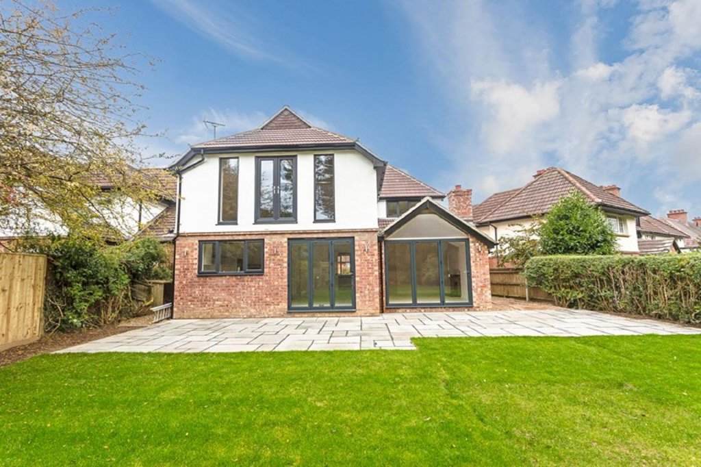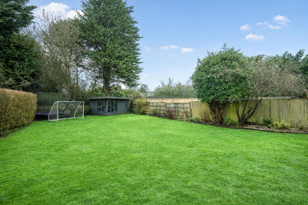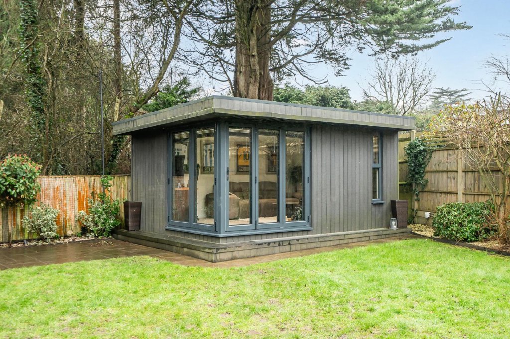 Stepping outside, the full-width paved terrace spans the rear of the property and is directly accessed from both the kitchen/family room and living room — ideal for entertaining. The terrace opens onto an extensive, level lawn bordered by mature trees and shrubs, with timber fencing to all boundaries and useful side access. The south-facing rear garden extends to approximately 80 feet. To the rear of the garden sits a recently installed GARDEN ROOM/HOME OFFICE, featuring cantilevered bi-folding doors, power, lighting and superfast internet cabling. This versatile space is currently used as a home office, or has uses as a possible gym or games room.