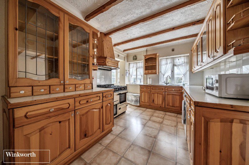 The kitchen is to the rear and has pine fronted units with a stainless steel sink and space for appliances. It also has the added bonus of a walk-in pantry. The large dining room is next door and has sliding patio doors to the garden.