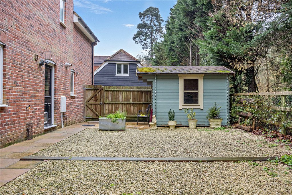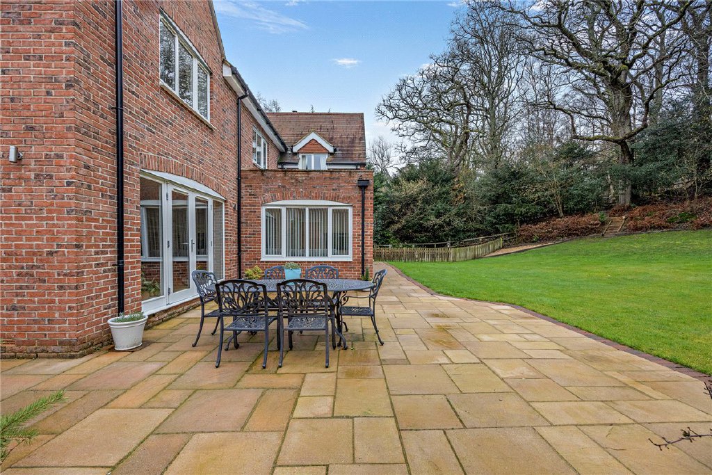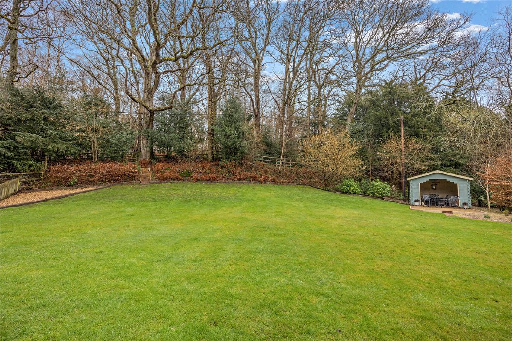 Surrounding the property is a level and private garden with a good sized paved terrace. To one side is ample driveway providing off road parking for a number of vehicles together with access to the garage. The garden extends mainly to the side and rear and has direct access onto Greenham Common. Situated to one side is the detached double garage which has the advantage of a separate bonus room above, with cloakroom on the ground floor, which could be used in a number of ways including an office/playroom etc.
