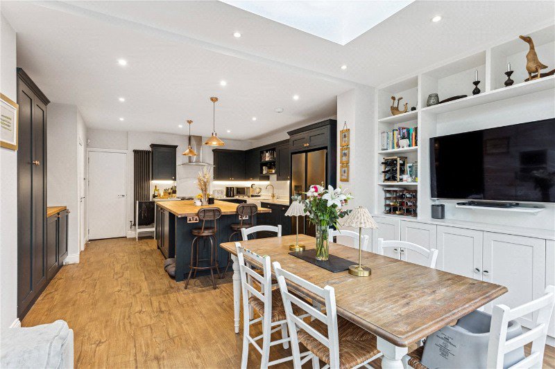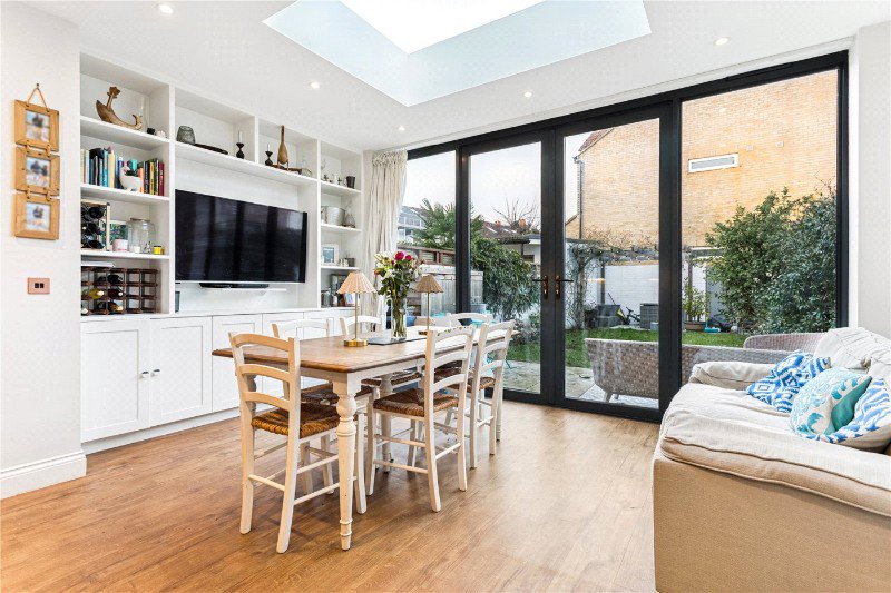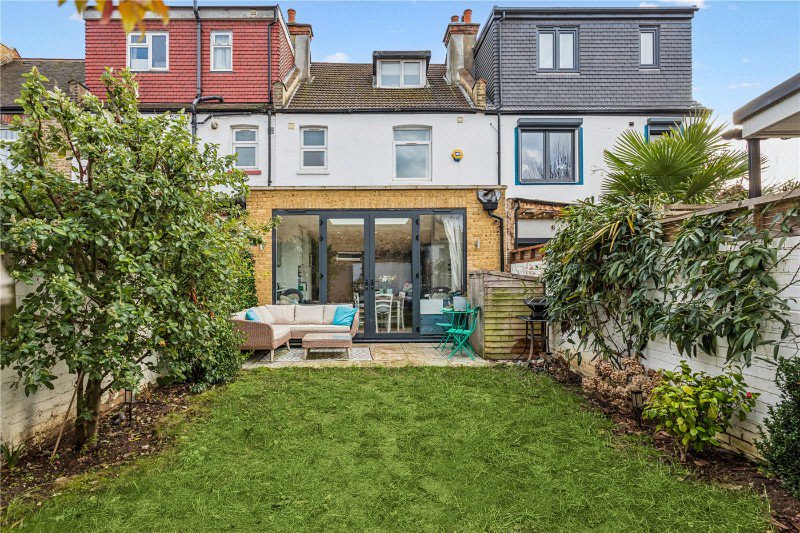Arranged over 1550 sqft, and over three floors, the property has been meticulously renovated to the highest standard offering five wonderful bedrooms, with the master bedroom featuring a large built-in wardrobe, one currently used as a home gym, and one as a nursery. A fabulous contemporary kitchen/dining room with large French doors leading to the immaculately presented south facing garden and a beautiful skylight over the dining room space. To the front of the house is a separate large reception room with a wonderful large bay window and a downstairs w/c.