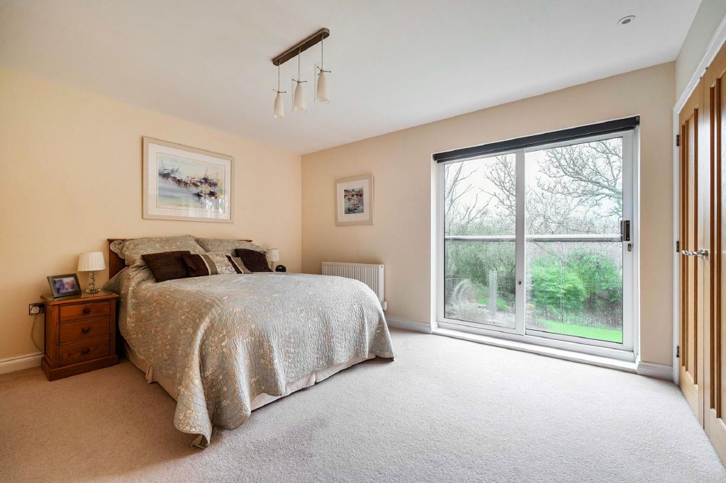 Upstairs, the sense of space continues with a bright and airy landing leading to five beautifully proportioned bedrooms. The principal suite enjoys a Juliet balcony overlooking the garden and cricket field beyond, creating a peaceful outlook and a sense of retreat, complemented by extensive fitted storage and a luxurious en-suite bathroom. The remaining bedrooms are all generously sized and versatile, most with fitted wardrobes, offering flexible accommodation for family, guests, or home working. A beautifully appointed family bathroom completes the first floor, with a bath and shower, providing a spa-like space for relaxation with high-quality finishes throughout.