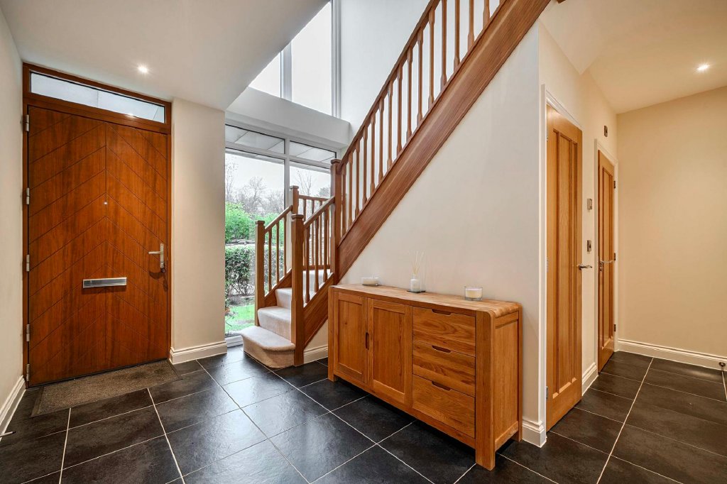 From the moment you enter, the home conveys an immediate sense of space, light, and quality. A traditional timber front door opens into an impressive entrance hallway, where striking floor-to-ceiling glazing fills the space with natural light and creates a seamless connection to the outdoors. Elegant ceramic tiled flooring, a solid oak staircase, and beautifully crafted finishes set the tone for the refined, yet welcoming atmosphere found throughout the home. Underfloor heating across the ground floor ensures year-round comfort, while oak internal doors and thoughtful chrome fittings enhance the sense of quality.