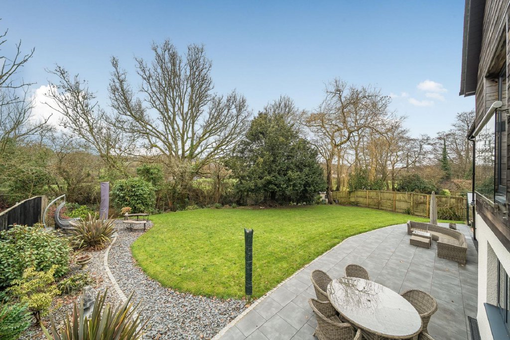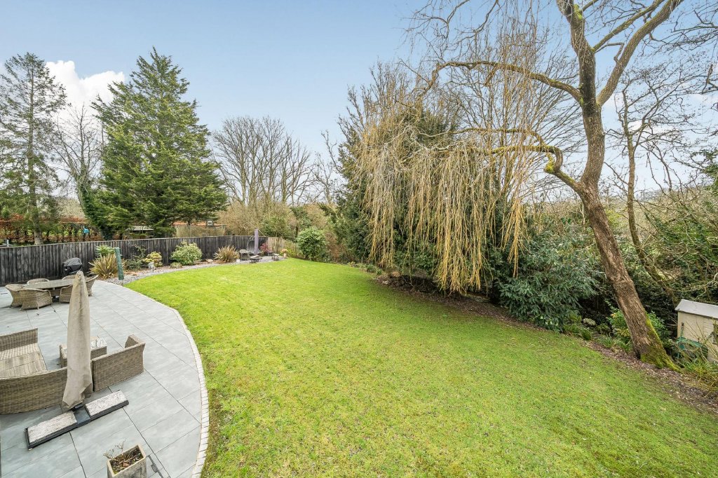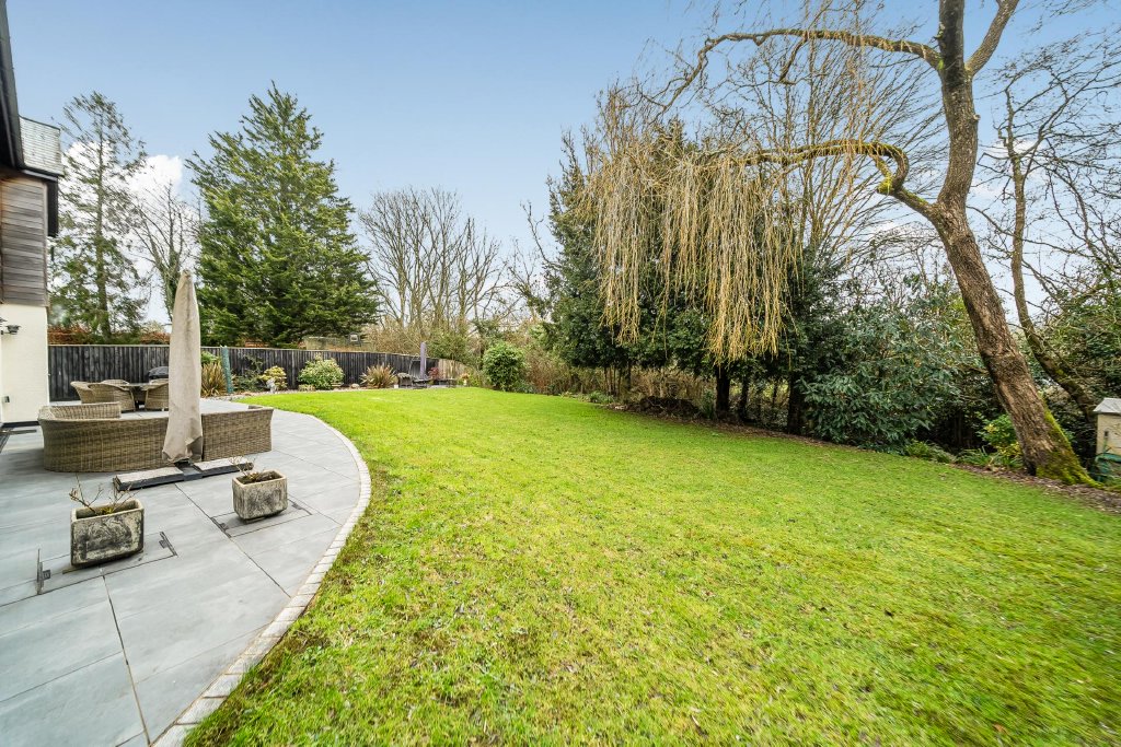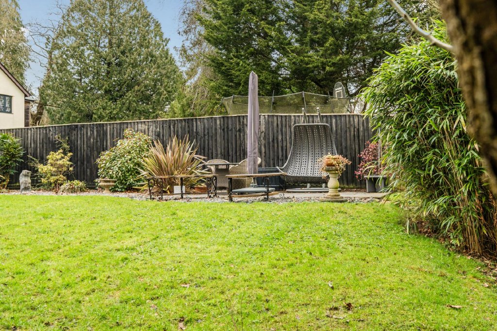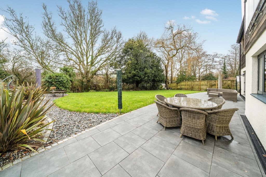 A substantial patio, laid in 2021, spans the width of the property, creating an exceptional space for outdoor dining, entertaining, or simply enjoying the surroundings. The garden is thoughtfully arranged with areas for relaxation, gardening, and play, including a landscaped seating area positioned to capture the evening sun. Expanses of lawn and established planting encourage exploration and enjoyment of the outdoor space.