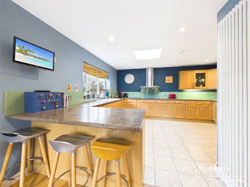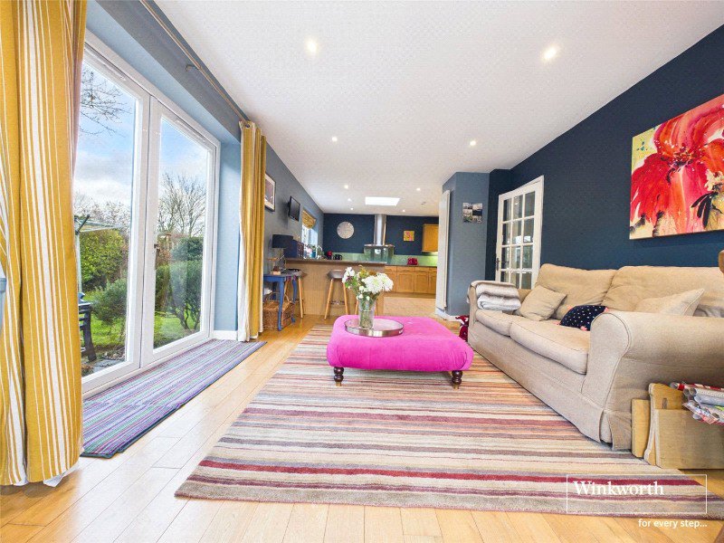 To the rear, the impressive extension forms the heart of the home. The stylish fitted kitchen, complete with breakfast bar, flows effortlessly into a family/dining area. With dual-aspect views over the wrap-around private garden, this space is perfectly designed for modern family life and entertaining.