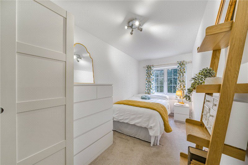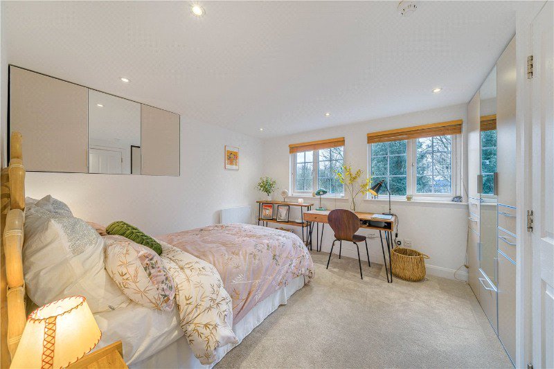 The primary bedroom features an ensuite bathroom with integrated bathroom storage, rainfall shower and a view of Canary Wharf - spectacular at night, when lit up. The bedroom has triple fitted mirrored wardrobes and cupboards, Venetian blinds and overlooks the woodland. The main bathroom has a bath, rainfall shower, integrated wc and basin with storage and a large illuminated mirror with shaver socket. A third bedroom features two double built in wardrobes. Three of the five bedrooms have stunning views onto the woodland. Beds, kitchen appliances and free-standing wardrobes and curtains can be left at the property by mutual agreement.