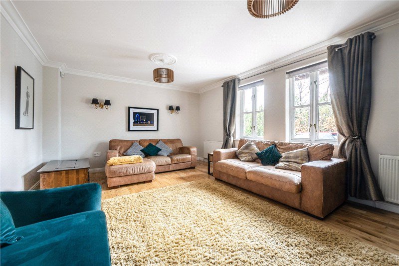 Upstairs, the principal bedroom is a particularly notable feature, with ample space for wardrobes and seating, and benefiting from a private en suite and a pleasant outlook with access to a balcony. Two further well-proportioned bedrooms are served by a family bathroom and further storage, offering flexible accommodation ideal for families, guests or home working.