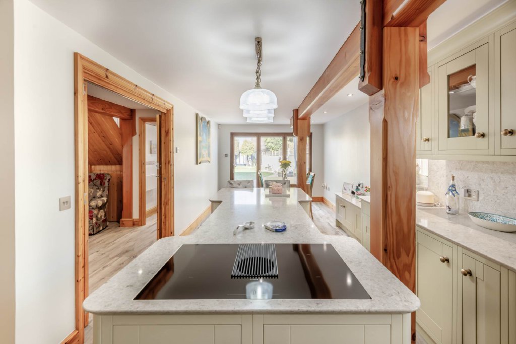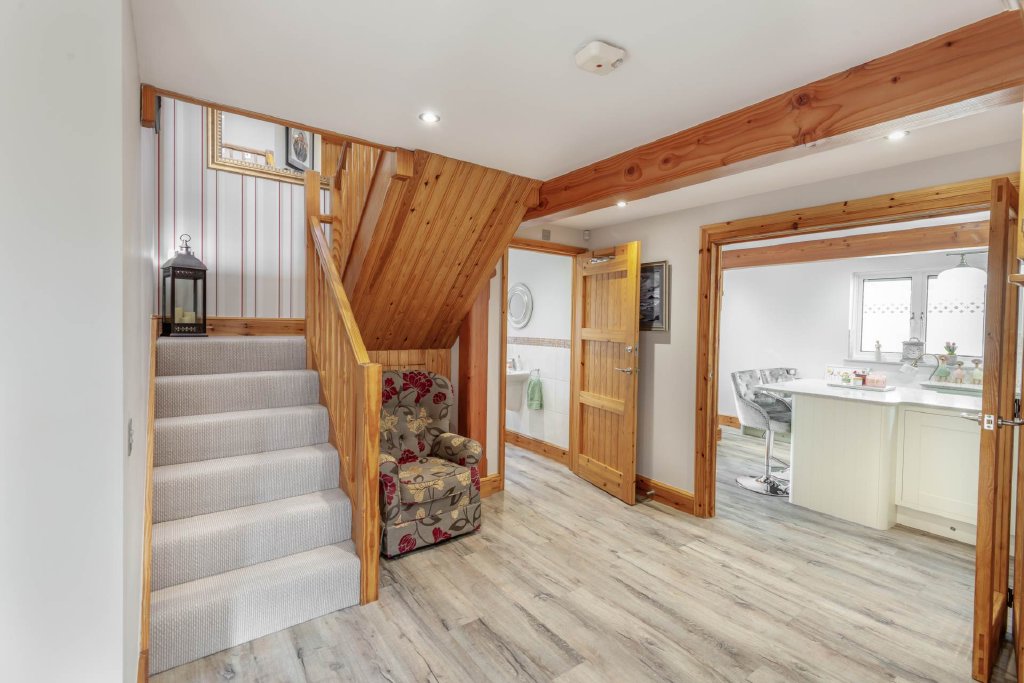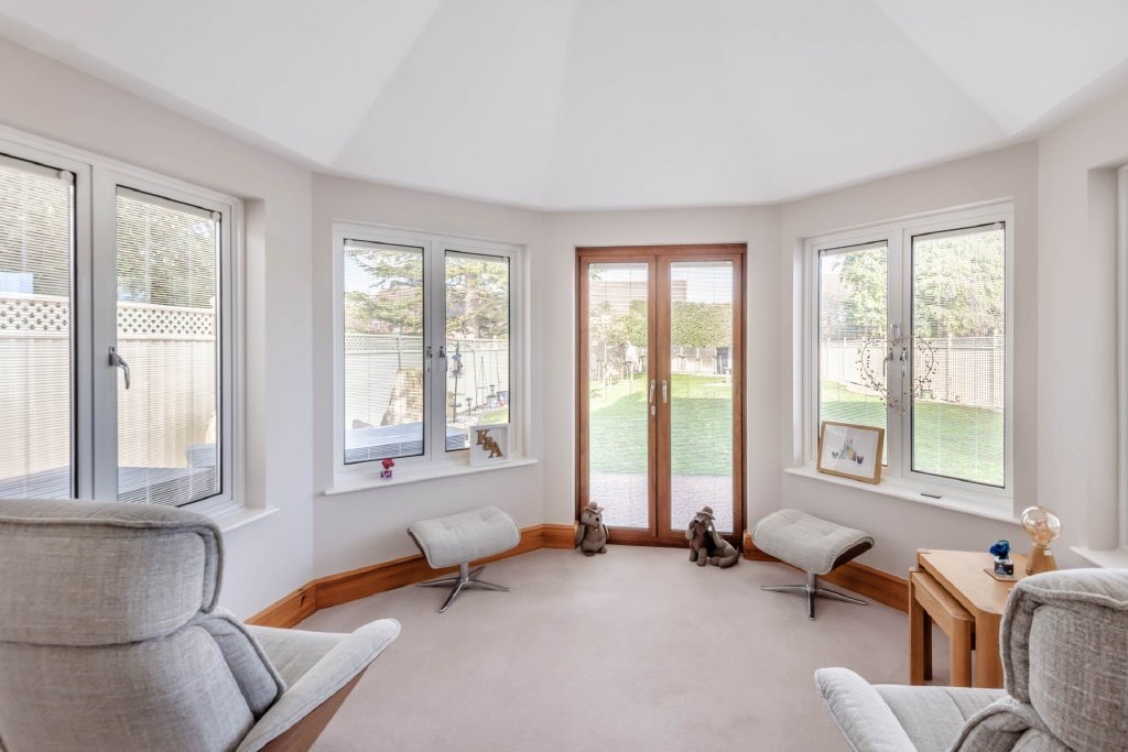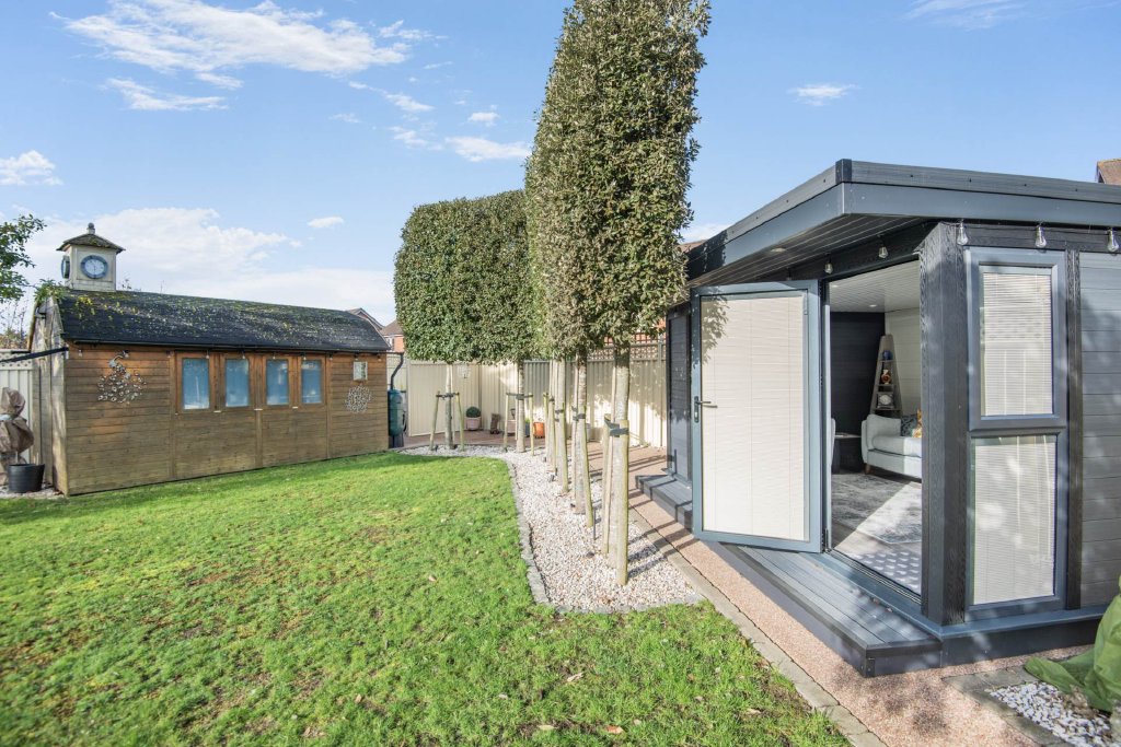 The outside impressive and versatile enjoying a commanding presence to the front, with ample parking for family and guests. The rear garden is thoughtfully landscaped, featuring a generous patio overlooking a tranquil lawn and well stocked borders. A Dutch barn style garden shed with power sits at the rear of the lawn. Adding exceptional flexibility is a fully air-conditioned independent annex with fold away doors and is perfect as a sun room, office, studio, or gym ideal for all modern lifestyles.