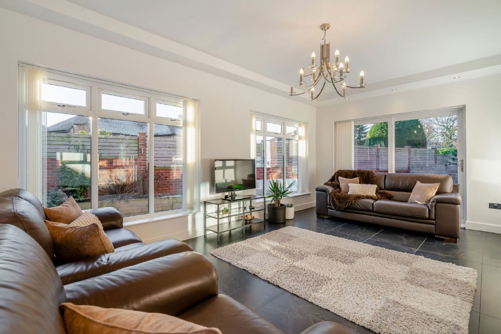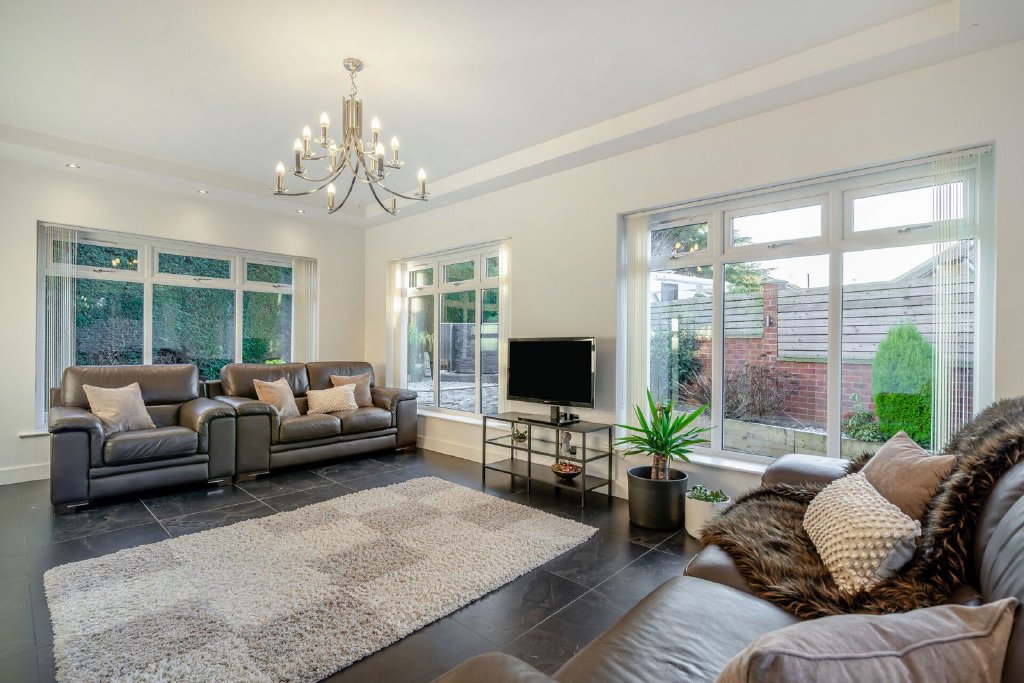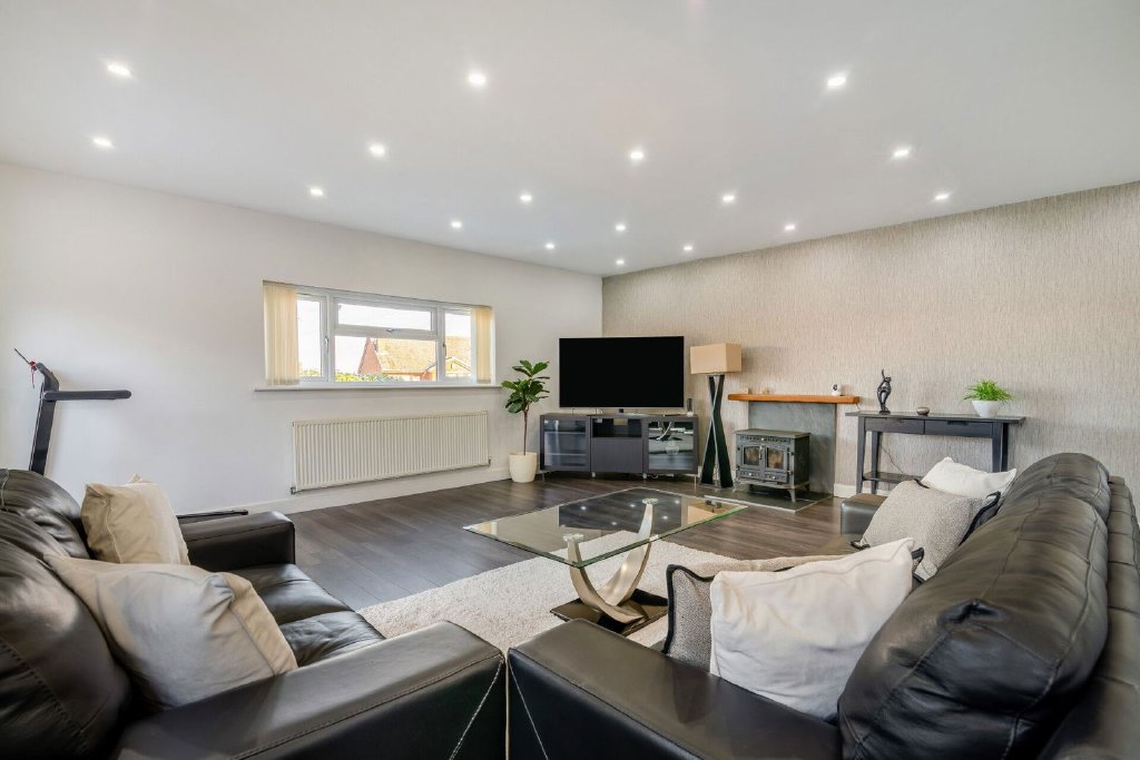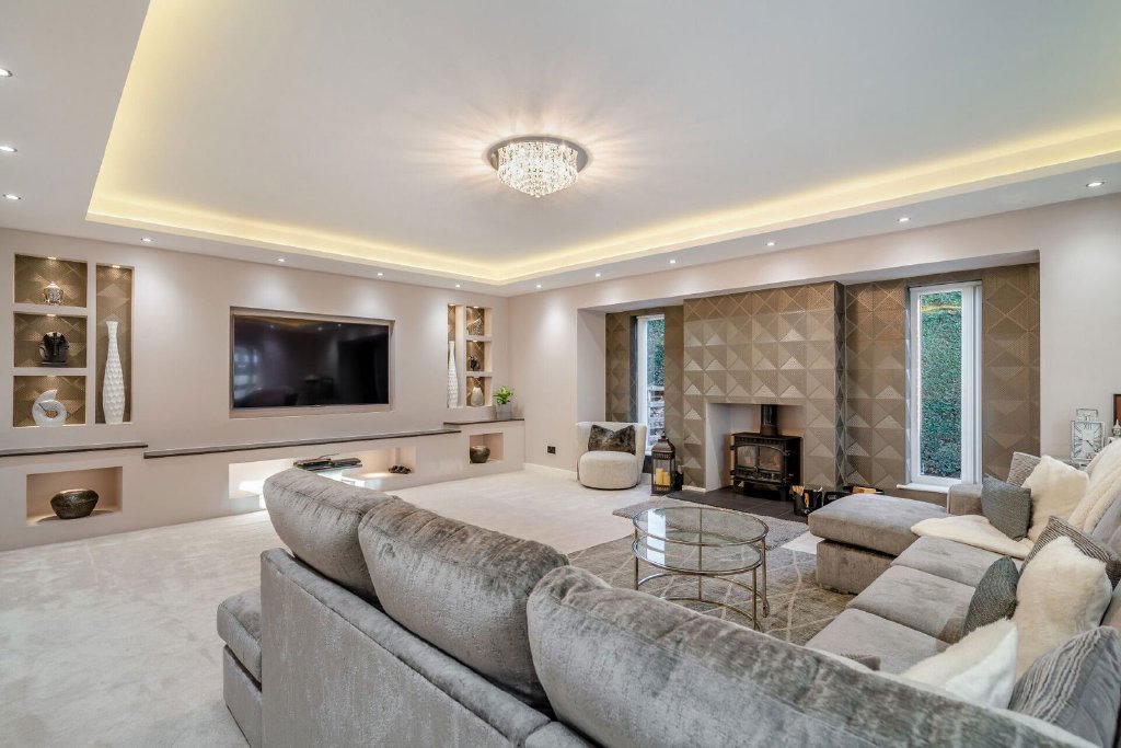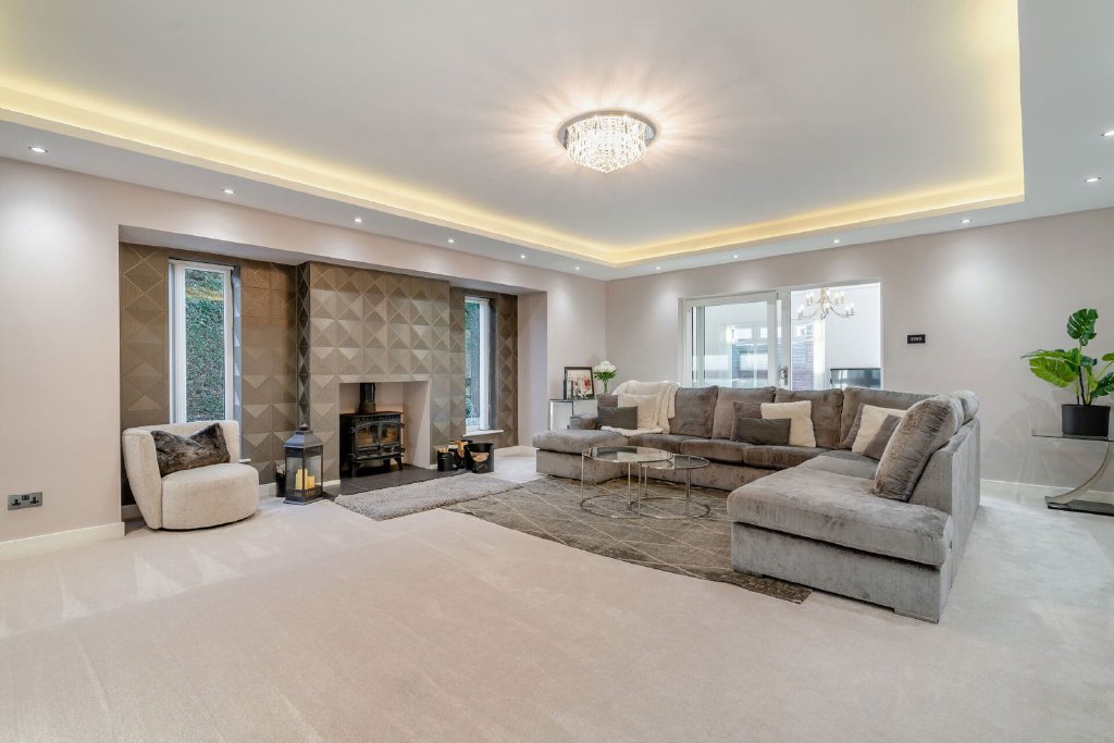 The lounge is exceptional offering expensive proportions with two full height windows that sit on either side of a chimney breast that is home to a woodburning stove that sits on a tiled hearth. This stunning room has inset spotlighting, concealed LED lighting and a media wall to the expense of one elevation; sliding doors gain access through to the garden room / orangery which has full tiling to the floor and windows to three aspects overlooking the gardens.