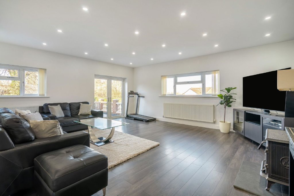From the kitchen steps lead up to the family room, a generous living space which offers versatile accommodation, ideal as a second, lounge, playroom or home office with twin doors opening directly on to a balconied terrace.