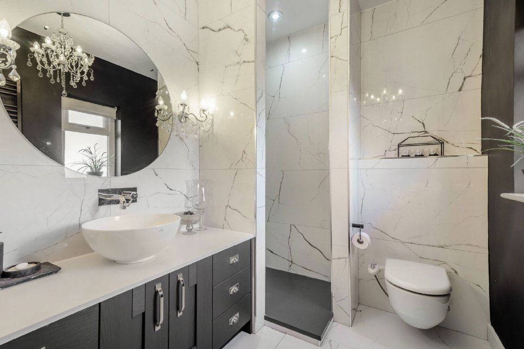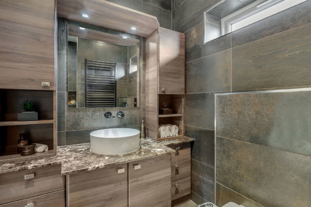 The family bathroom is presented with a four piece suite consisting of a double ended bath, a wash hand bowl which sits on a beautiful base with vanity cupboard beneath, a wall hung W.C and a wet room style shower with a fixed glass screen. The room offering generous proportions with full tiling to the walls and floor, two heated towel radiators and a frosted window.