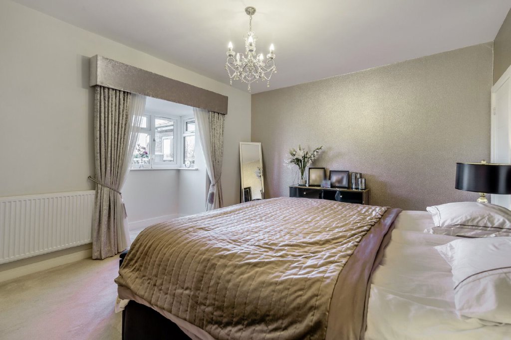 The principal bedroom suite offers generous double accommodation, a front facing room with a bow window overlooking the front courtyard, a walk-in wardrobe, whilst an en-suite shower room presents a modern three-piece suite incorporating a wall hung W.C, a shower and a vanity unit with Porcelanosa wash hand basin over, the room complemented by feature tiling to the walls and floor, a towel radiator and frosted window.
