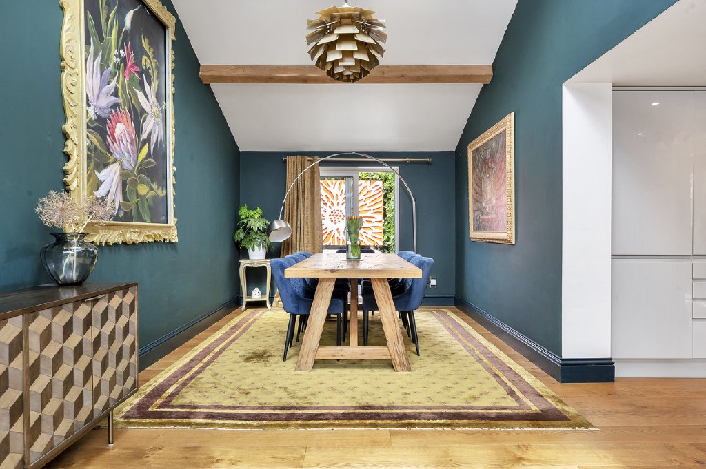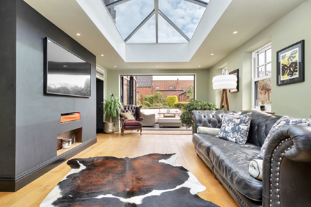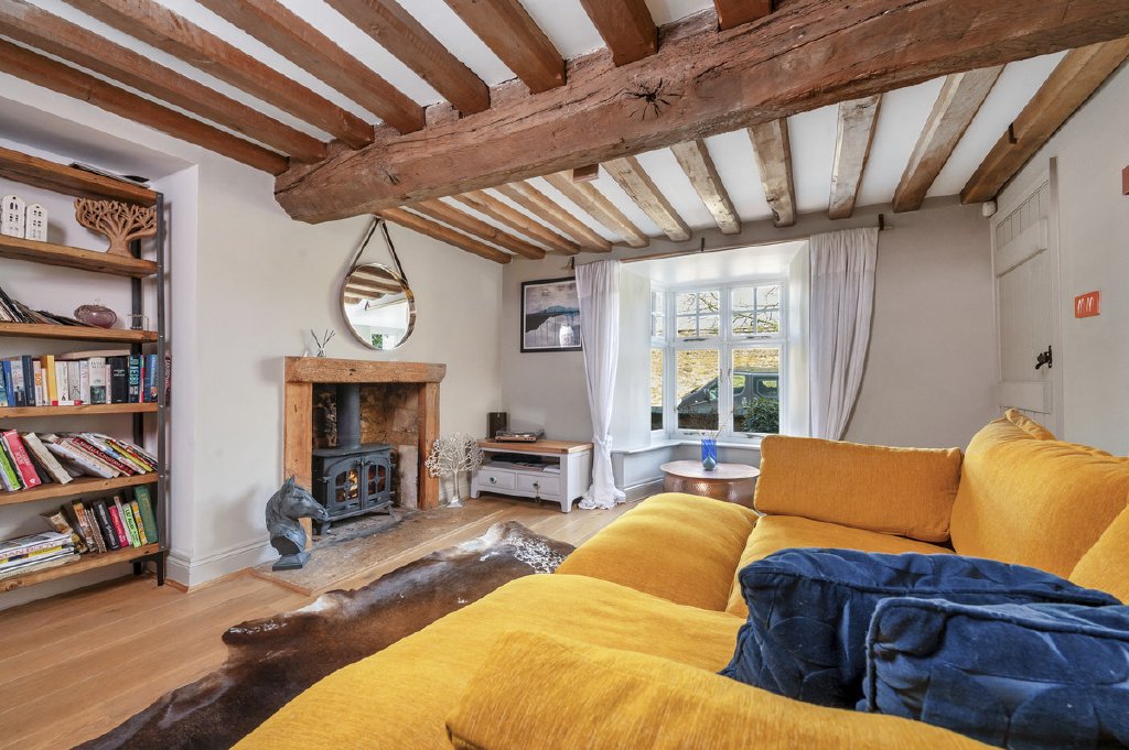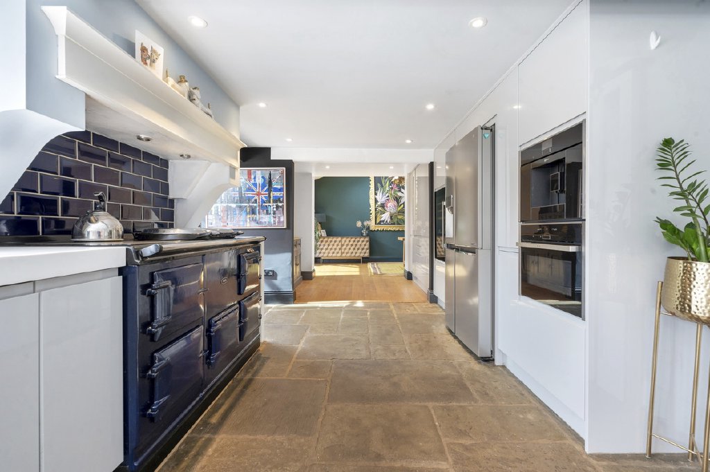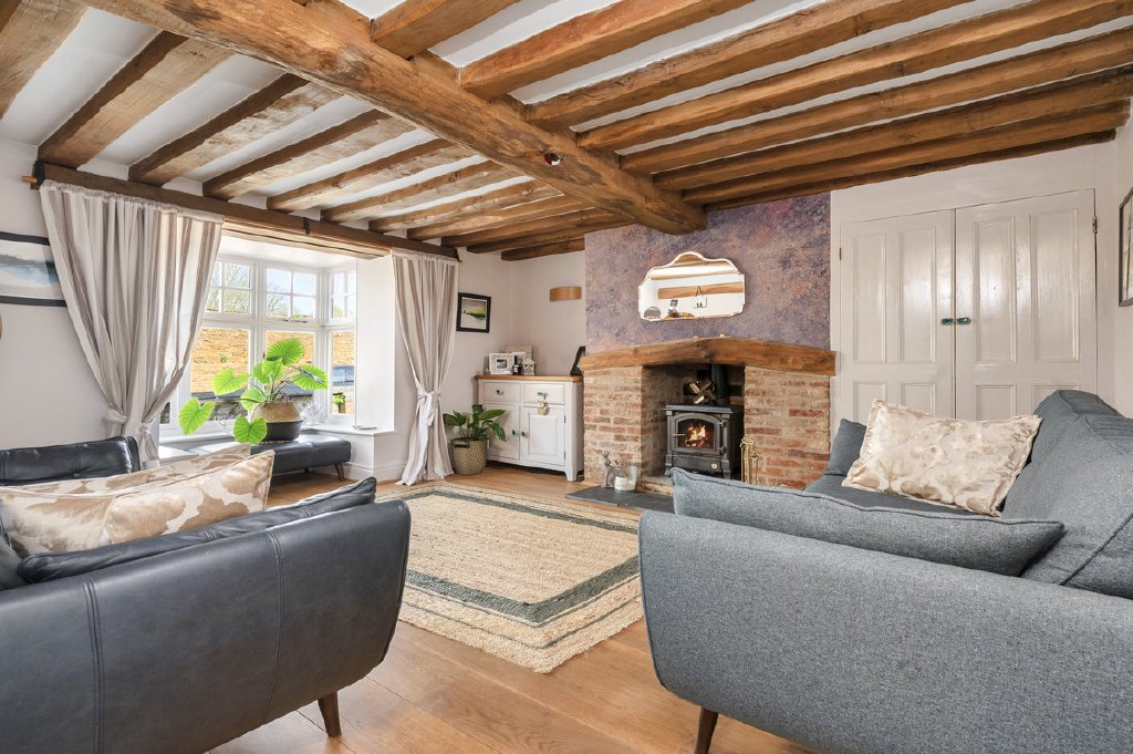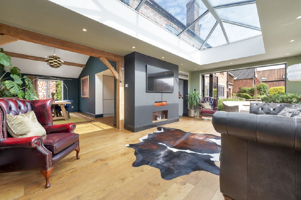 Accessed via the front door, the entrance hall features elegant oak flooring and a staircase rising to the first floor, leading into the sitting room, where a charming bay window frames the front aspect. Original exposed beams and a multi-fuel burning stove create a warm, inviting atmosphere. Adjacent, a further living room boasts a second bay window to the front, a central fireplace with a cast iron multi-fuel stove and exposed ceiling beams, combining period character with modern comfort. The spacious kitchen is a statement of style and functionality, fitted with bespoke high-gloss base units, Corian worktops, a sleek sink with mixer tap, electric Aga, integrated microwave, coffee machine, dishwasher, wine cooler, and space for an American-style fridge freezer. Flagstone flooring, two rear-aspect windows, and a side door complete this impressive culinary space. An inner hallway leads to the dining room, featuring a vaulted ceiling with two automatic rooflights, oak flooring with underfloor heating, and sliding patio doors opening onto an enclosed courtyard, complete with outdoor lighting and power connections, perfect for alfresco entertaining. The Garden Room is a light-filled retreat with bi-folding doors to a patio terrace, underfloor heating, and a contemporary multi-fuel stove, seamlessly blending indoor and outdoor living. From the kitchen, a stable door provides access to a versatile two-storey wing. The ground floor offers a shower room, study, and dressing room, while stairs rise to a mezzanine level featuring a double bedroom with a rear-facing skylight, ideal as guest accommodation or a private home office.