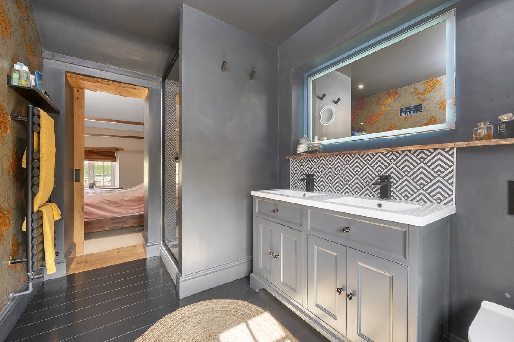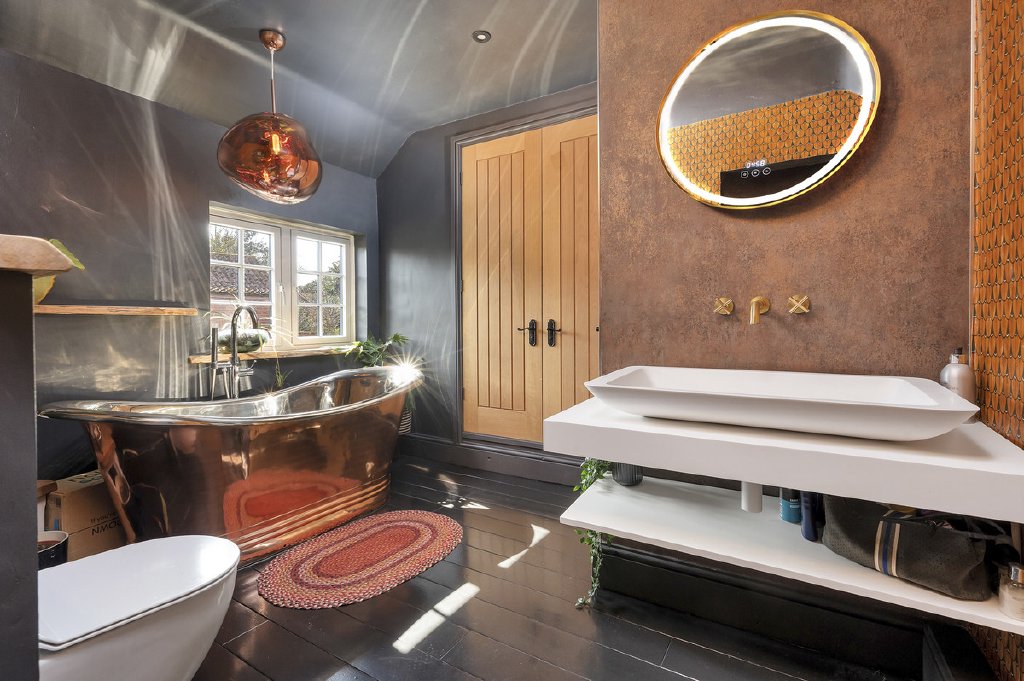 The staircase rises to a bright and welcoming first-floor landing, providing access to three double bedrooms and a well-appointed en-suite shower room. The family bathroom combines style and sophistication, featuring a four-piece suite with a freestanding copper slipper bath, floating toilet, contemporary wash basin, and a walk-in rain-style shower with gold fittings. A large linen cupboard discreetly houses the hot water cylinder.