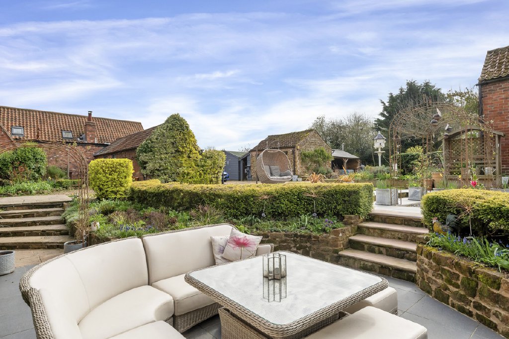 The gardens themselves extend to approximately 0.45 acres and are thoughtfully designed for both beauty and entertaining. A courtyard-style area separates the outbuildings and is ideal for alfresco dining, while a two-tier paved terrace leads from the Garden Room to a raised seating area, complete with a central lawn and a cascading water feature flowing into a pond. The grounds are further enhanced by well-stocked flower beds, shaped topiary, box hedging, and a vast lawn bordered by mature trees and established boundaries, offering both privacy and tranquillity.