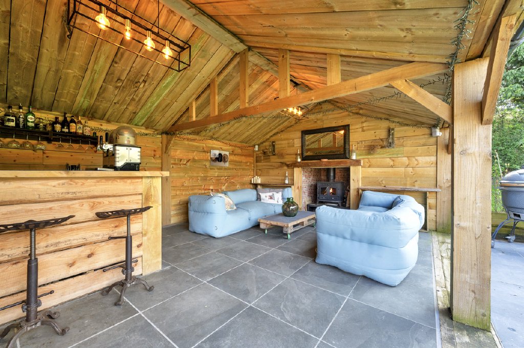 A gated gravel driveway sweeps up to a double carport and an impressive array of brick, stone, and timber outbuildings with pan-tile roofs, offering exceptional versatility, storage, and potential for further conversion. This includes a tool shed, a large timber workshop, a log store, and a substantial garden store with a vaulted ceiling, rear-facing glazed window, and full power and lighting, all ideal for a variety of uses. One of the outbuildings houses the oil tank, while a concealed laundry room is fully plumbed, fitted with units, a Belfast sink, and space for appliances. A stylish outdoor WC complements the outdoor facilities, finished with contemporary tiling, pendant lighting, and a wash hand basin. A standout feature is the open-sided bar and entertaining lounge, complete with a cast iron multi-fuel stove, slate-tiled floor, fully fitted bar, ceiling lights, and an integrated sound system. Connected to power and lighting, this space overlooks the beautifully landscaped gardens and offers the perfect setting for outdoor gatherings. A glass greenhouse adds a touch of charm and practicality to the grounds.