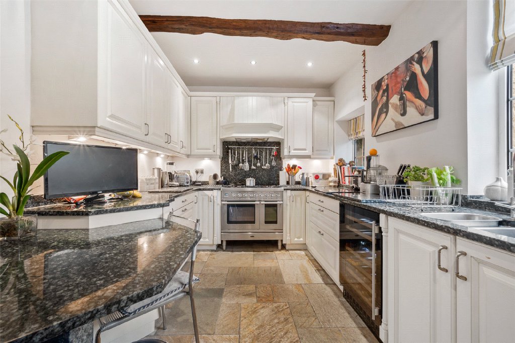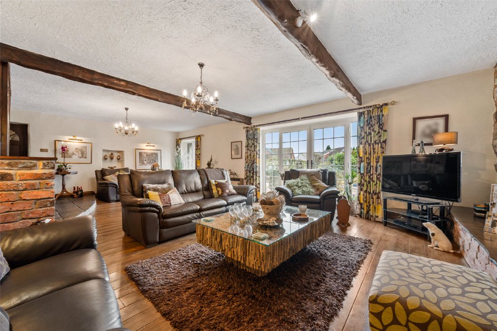Inside, the house blends period charm with modern convenience effortlessly. Exposed stonework, oak beams, solid oak flooring and stone flags sit comfortably alongside contemporary fittings and thoughtful design. A timber-framed entrance porch opens into a welcoming hallway with oak flooring and a stylish ground floor WC incorporating fitted storage and utility plumbing. The formal dining room sits at the centre of the home and acts as a natural hub, featuring a decorative stone fireplace and access to both the snug and the main living room. The living room itself occupies the full footprint of the former barn and is an impressive, light-filled space with French doors opening to the gardens, an exposed stone feature wall with gas fired log-burning effect stove, split-level slate and oak flooring, and a staircase rising to the first floor. The snug provides a cosy alternative reception room, complete with a brick and stone fireplace with wood burner, oak mantel, and its own staircase to the upper level. The kitchen is both functional and well-appointed, fitted with granite worktops, a breakfast bar, and a range of base and wall units. Appliances include a Britannia range cooker with five-ring gas hob and double oven, an integrated Neff combination oven, and full-height integrated fridge and freezer. An under-stairs pantry offers additional storage.