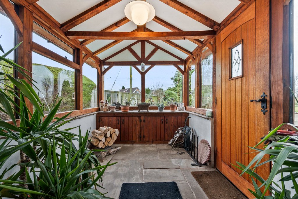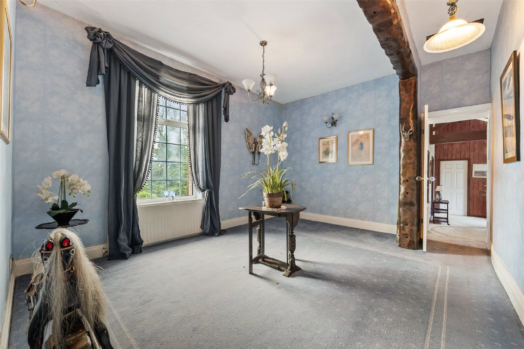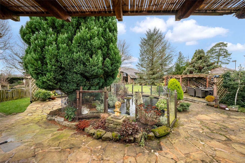 The property is approached through a gated entrance or supplementary side entrance both leading onto a sweeping driveway bordered by mature hedging and established trees, immediately setting the tone for what follows. The grounds are a standout feature, offering both privacy and versatility, with the potential for future development or subdivision (subject to an overage agreement). Landscaped lawns, stone-flagged patios, a sizeable koi pond, decked seating areas, an outdoor kitchen space, and a detached stone-built garage/workshop of approximately 770 sq ft all combine to create a setting that is as practical as it is picturesque.