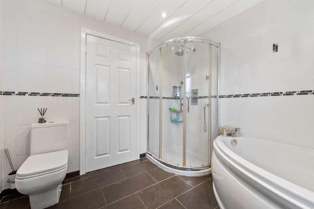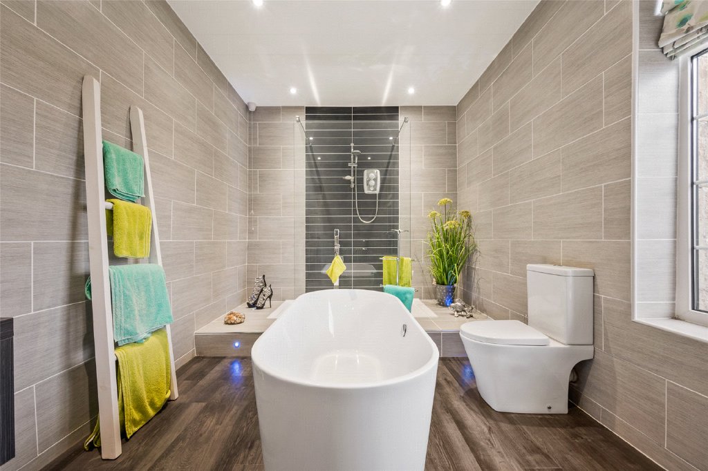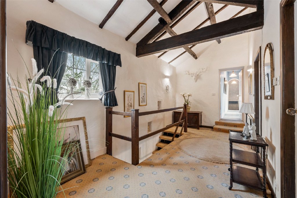 Upstairs, an impressive landing with exposed roof trusses leads to four well-sized bedrooms. The principal bedroom enjoys views across the gardens and open fields and benefits from fitted wardrobes and a generous en-suite bathroom featuring a bath, corner shower, vanity basin, and WC. Bedrooms two and three are large doubles, both with fitted wardrobes, while the fourth bedroom is a comfortable single, ideal for home working, overlooking the rear gardens. An inner landing—formerly a fifth bedroom—now provides a light and airy connecting space. The family bathroom is modern and finished to a high standard, with a freestanding oval bath, walk-in shower, vanity unit and WC.