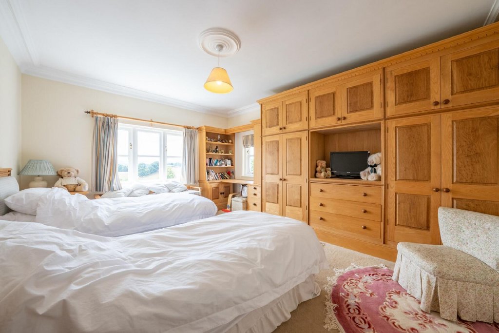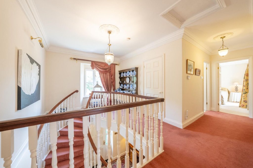 Ascending the staircase, the first floor reveals five generously proportioned bedrooms. Two of these benefit from stylish en-suite facilities, while the remaining rooms are served by a well-appointed family bathroom. The principal suite is particularly impressive, boasting dual-aspect views that capture the charm and tranquillity of the rural setting from every window.