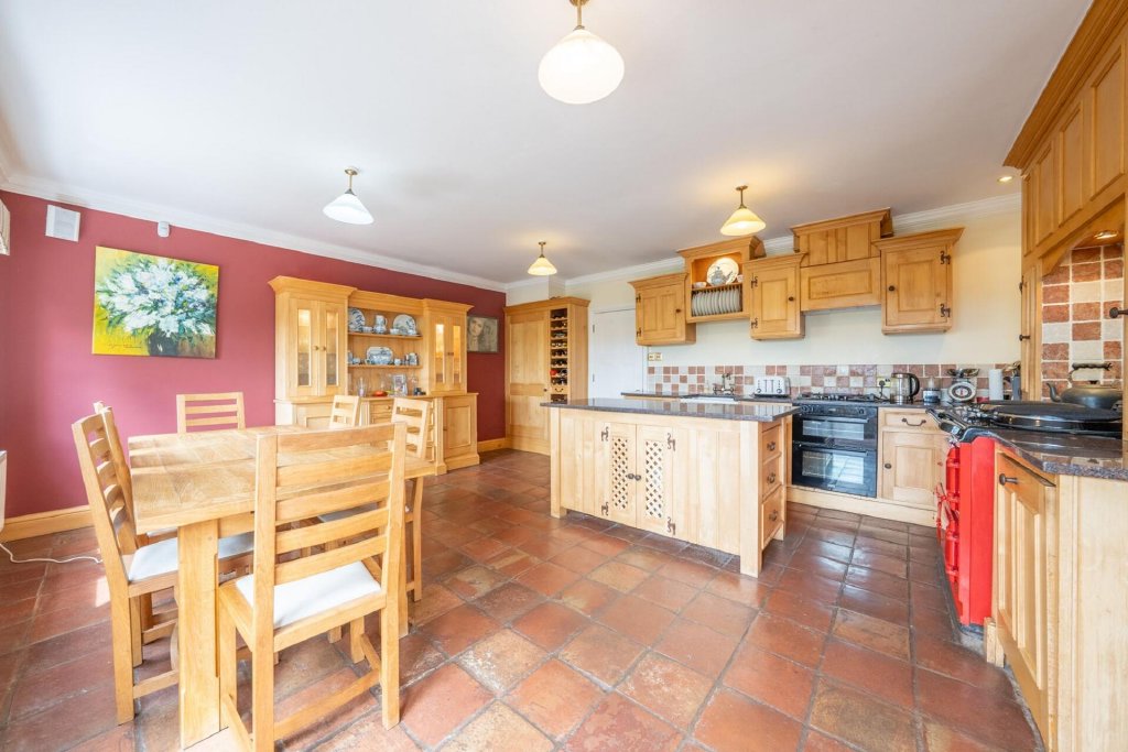At the heart of the home lies the open-plan kitchen a true centrepiece. Featuring bespoke cabinetry, a traditional Aga, and doors that open out to breathtaking vistas of the surrounding countryside, this space is both effortlessly practical and undeniably picturesque.