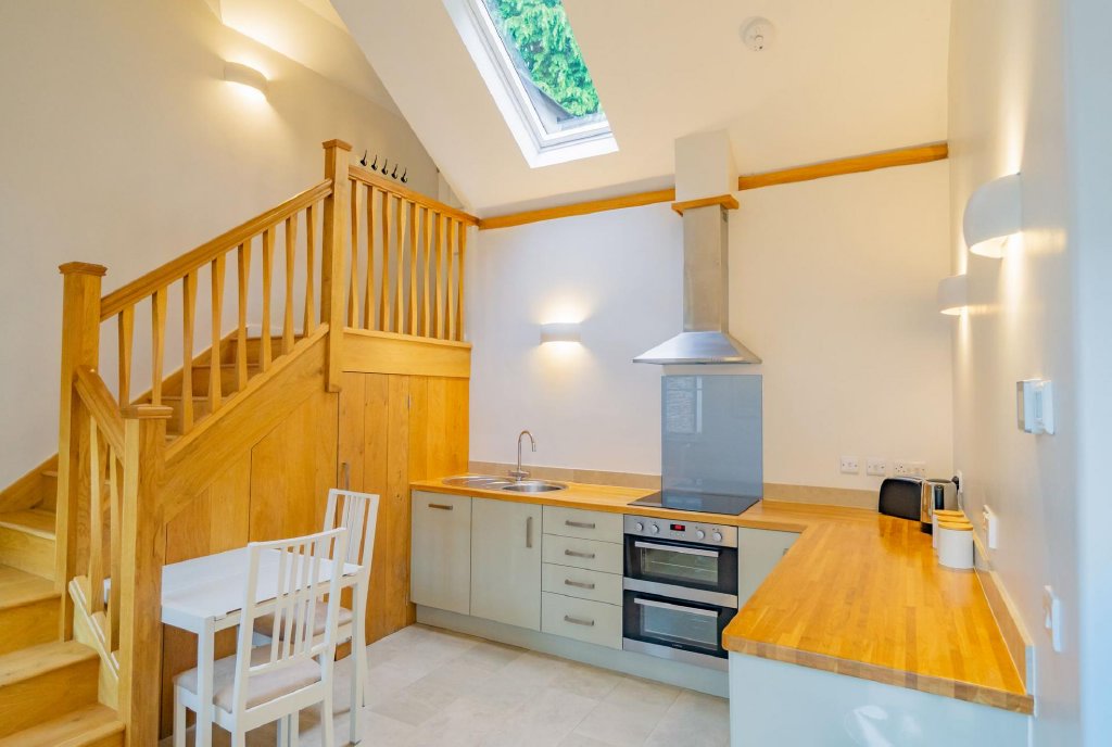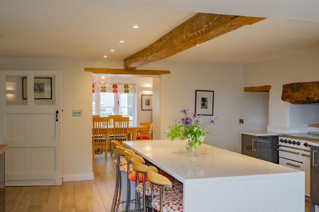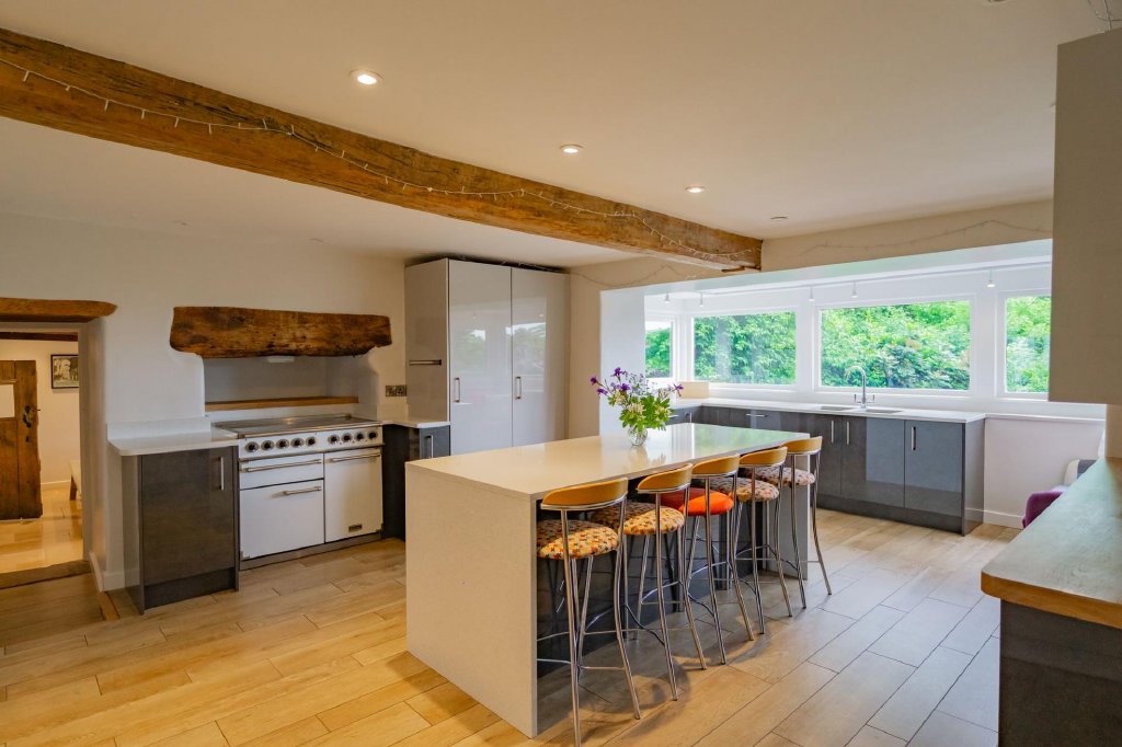 A wall of windows provided by a small extension allow plenty of light into this area and frames views of the garden, combining effortlessly with old wooden beams to offer a kitchen that feels fresh, clean and airy.