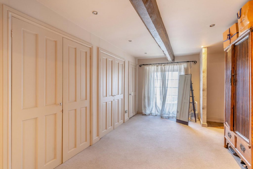 The first floor is mainly dedicated to the sumptuous master suite, featuring a spacious bedroom with exposed beams, a fireplace, and wooden flooring. The suite also boasts a large dressing room with extensive fitted wardrobes and an elegant en-suite bathroom with both a separate bath and shower, styled in a classic black and white theme. A second bedroom overlooks the tranquil rear garden.