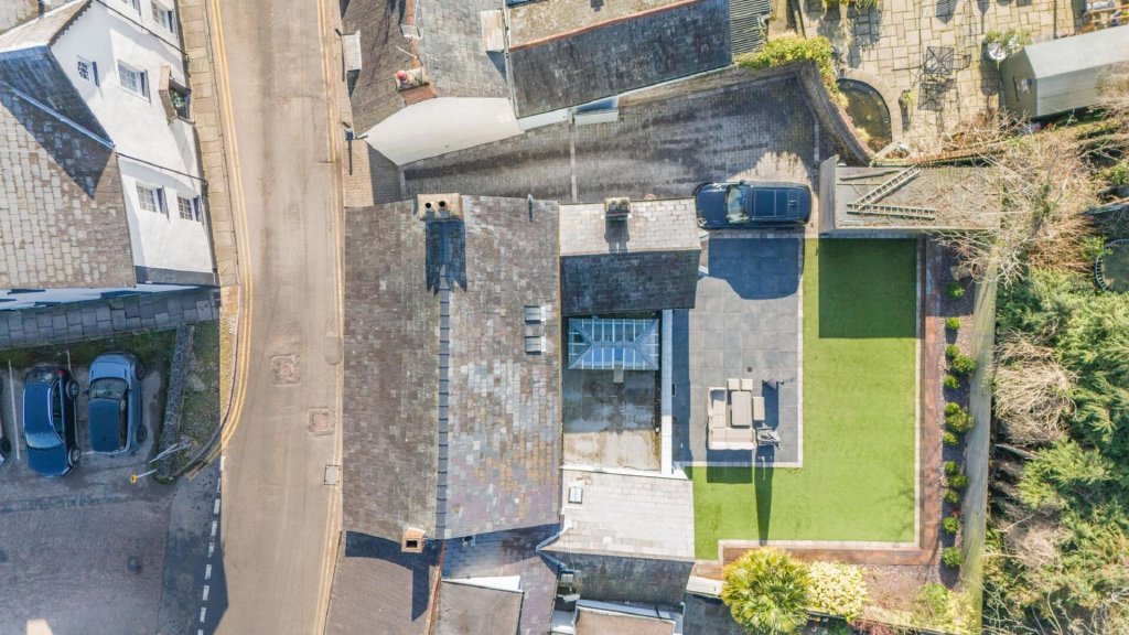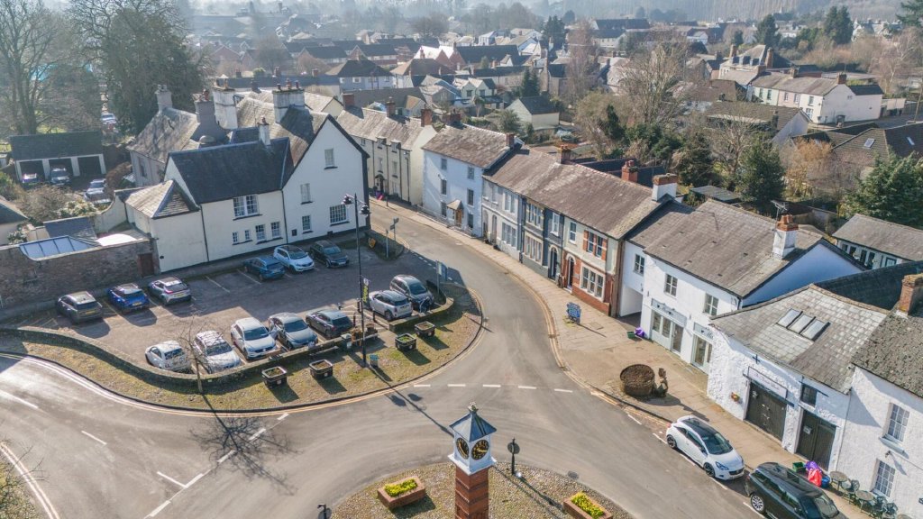 Gated driveway, parking, and a private garden in the heart of Usk. A side vehicular entrance is controlled by electrically operated double gates, providing valuable parking for several vehicles, including a pair of EV charging points.