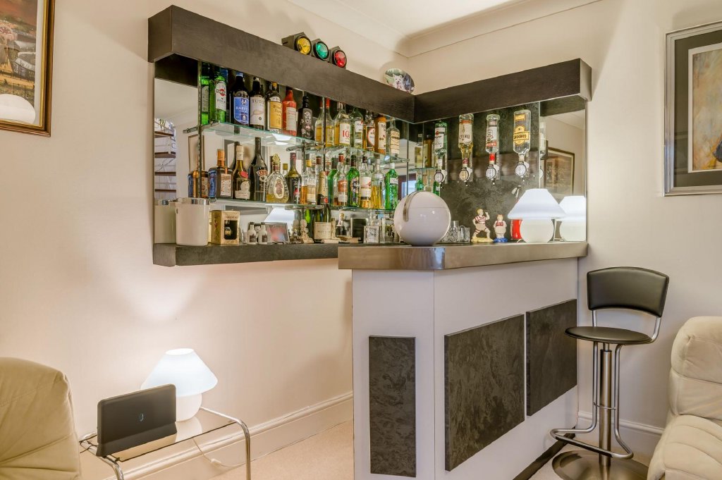Double glass-panelled doors lead from the sitting room is a cosy snug, in which the current owners have placed a small bar. A glazed double doorway leads into a sunny half-hexagonal conservatory that looks out over the spacious back garden and allows plenty of natural light to flood into this part of the house.