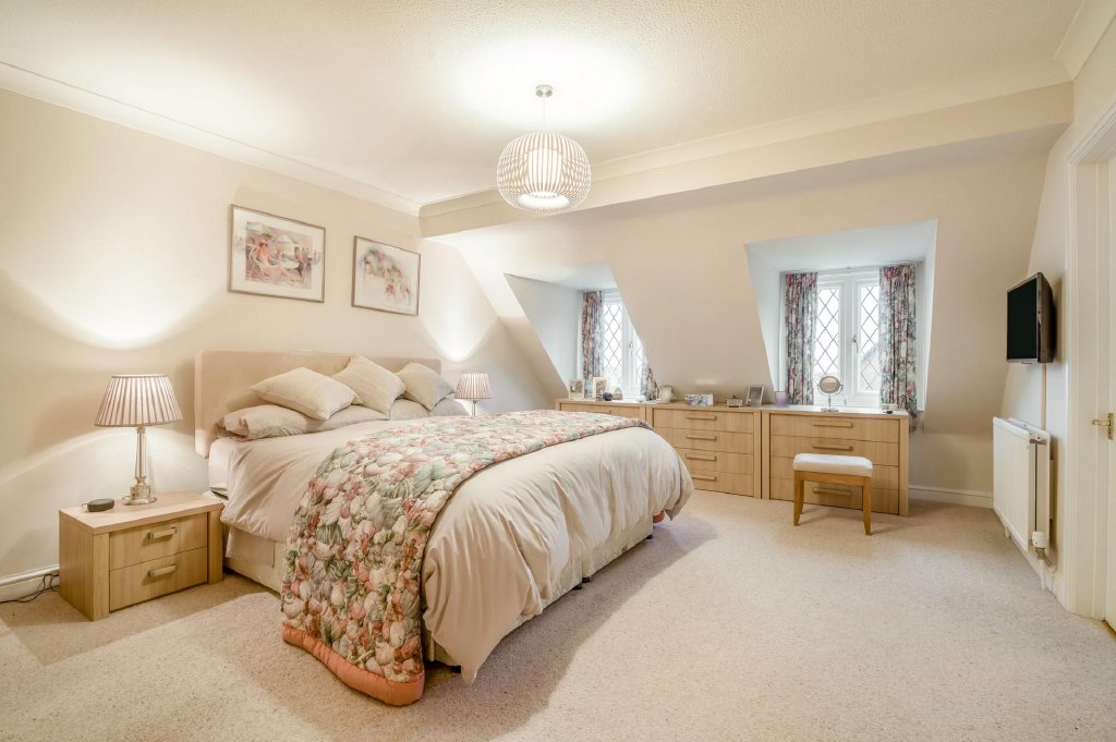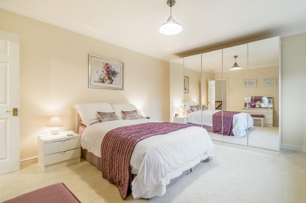 The hall staircase leads to four double bedrooms, two with views over the back garden and two looking out over the front lawn. The principal bedroom has its own en suite. There’s also a large luxury family bathroom with a roll top bath, walk-in shower and attractive tiling.