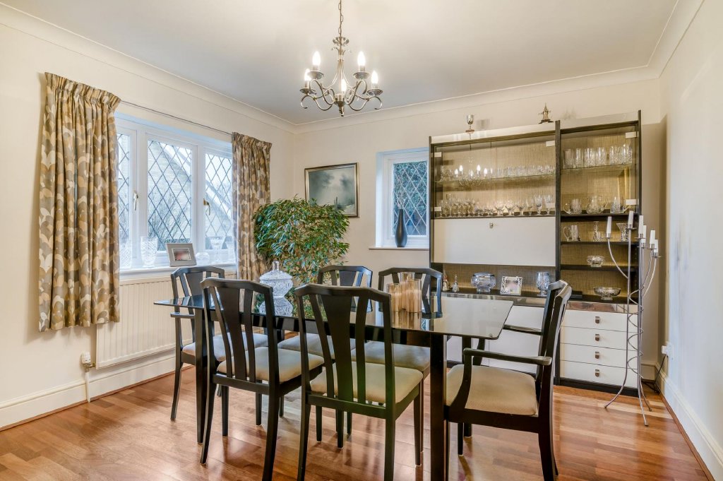 The dining room sits across the hall and is large enough to accommodate a six-seater table. It has a laminated wooden floor and looks out over shrubs in the front garden.