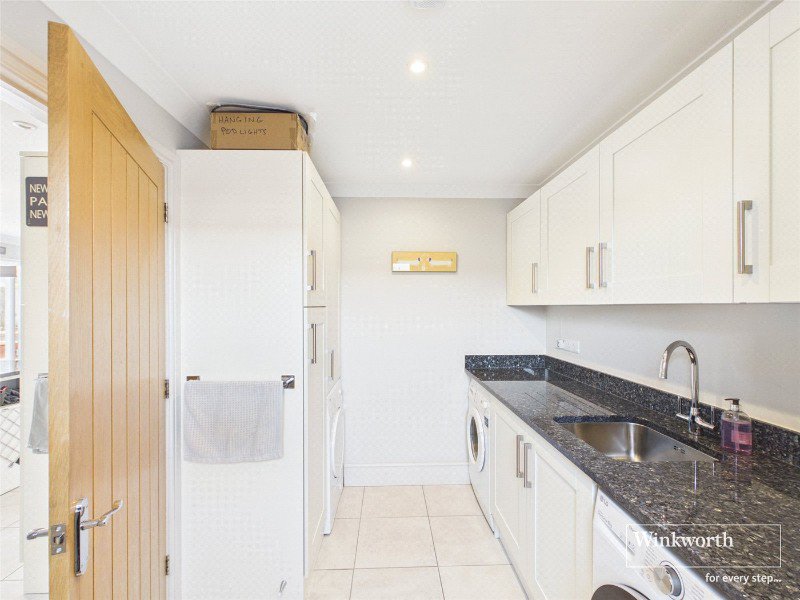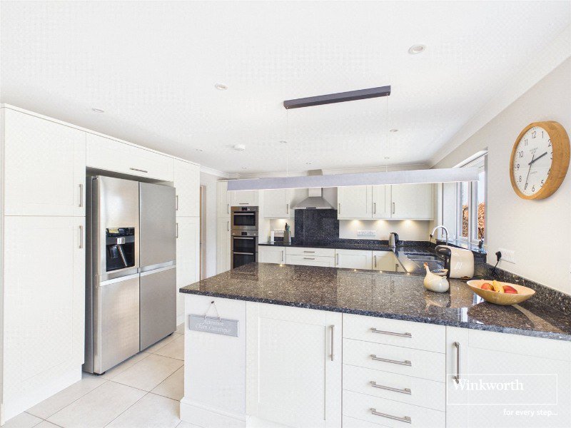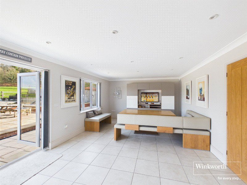 The dual-aspect sitting room is centred around a wood-burning stove and benefits from French doors opening directly onto the garden, creating a seamless connection between inside and out. The impressive open-plan kitchen, dining and family room forms the heart of the home, fitted with sleek contemporary cabinetry and integrated appliances, with further French doors opening onto the terrace. A separate utility room ensures everyday functionality remains discreetly positioned.