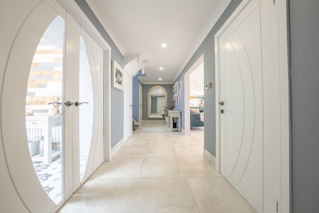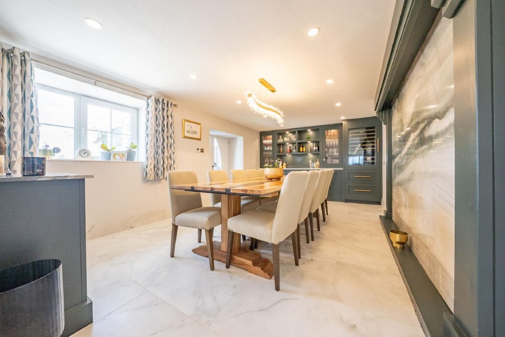 The kitchen flows naturally into the living area, a sociable space ideal for entertaining guests, whether gathering around the seating areas or spilling out through doors onto the sun-soaked patio. Completing the open-plan area is a striking dining room, complete with a bespoke feature walla true design statement that perfectly balances contemporary flair with countryside charm.