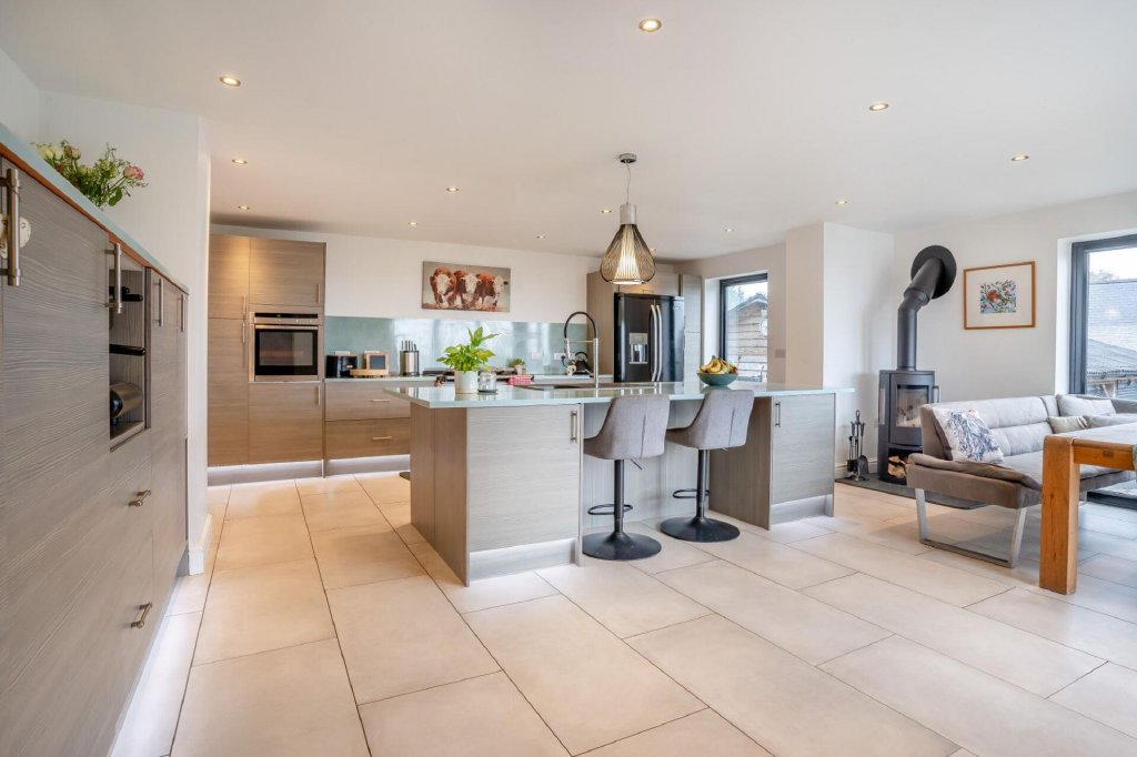 There is a breakfast bar and in front of the bifold doors there is a seating area, where a wood burning stove has been installed. A glazed door to one side of the kitchen leads straight to the gardens. The other side of the kitchen is a useful utility room, with modern fitted cupboards and space and plumbing for a washing machine and automatic dryer.