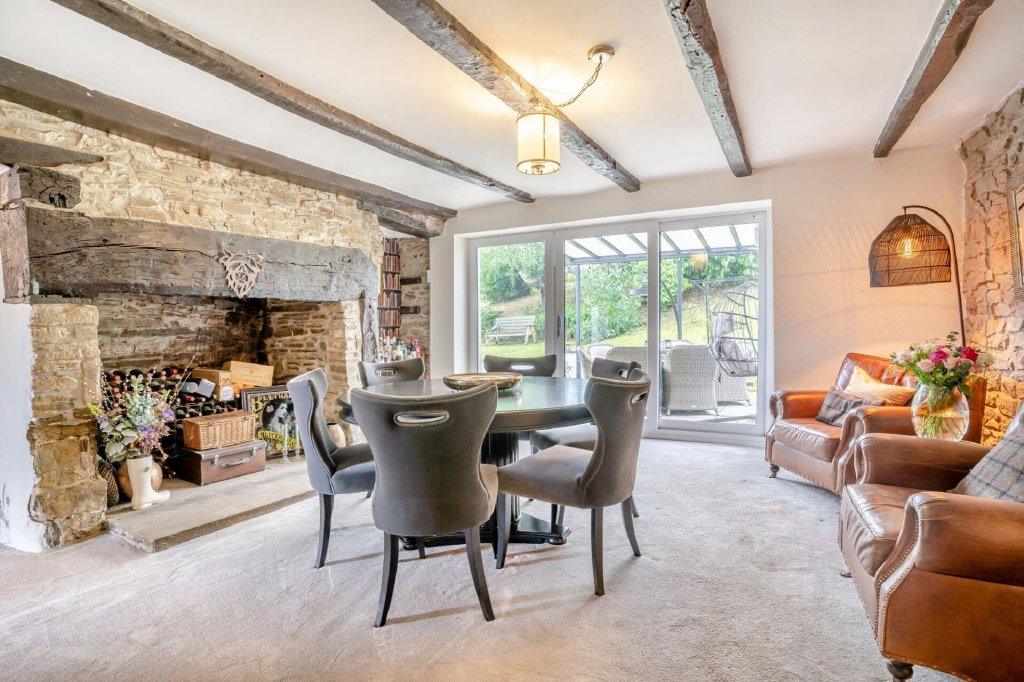 In the old part of the farmhouse there are two reception rooms, full of traditional character. The dining room is an imaginative fusion of ancient and modern, flooded with natural light from glazed doors along one wall, yet retaining the historic charm of an oak beamed ceiling, exposed stone wall and original open fireplace, with an old oak beam over. The glazed doors open to an enchanting, covered outdoor dining and entertaining area.